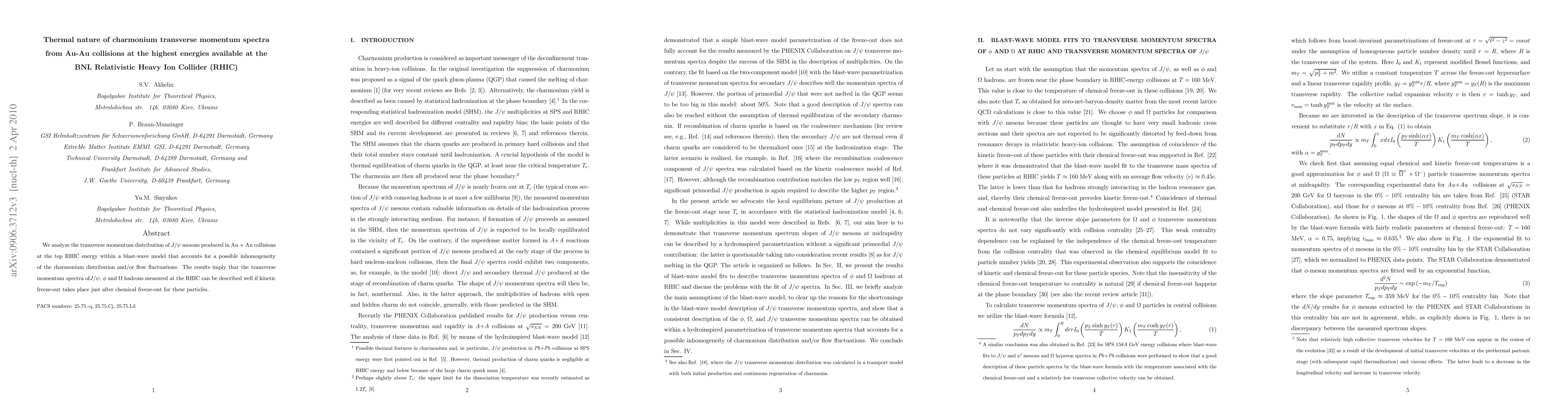 We analyze the transverse momentum distribution of $J/\psi$ mesons produced in Au + Au collisions at the top RHIC energy within a blast-wave model that accounts for a possible inhomogeneity of the charmonium distribution and/or flow fluctuations. The results imply that the transverse momentum spectra of$J/\psi$, $\phi$ and $\Omega$ hadrons measured at the RHIC can be described well if kinetic freeze-out takes place just after chemical freeze-out for these particles.