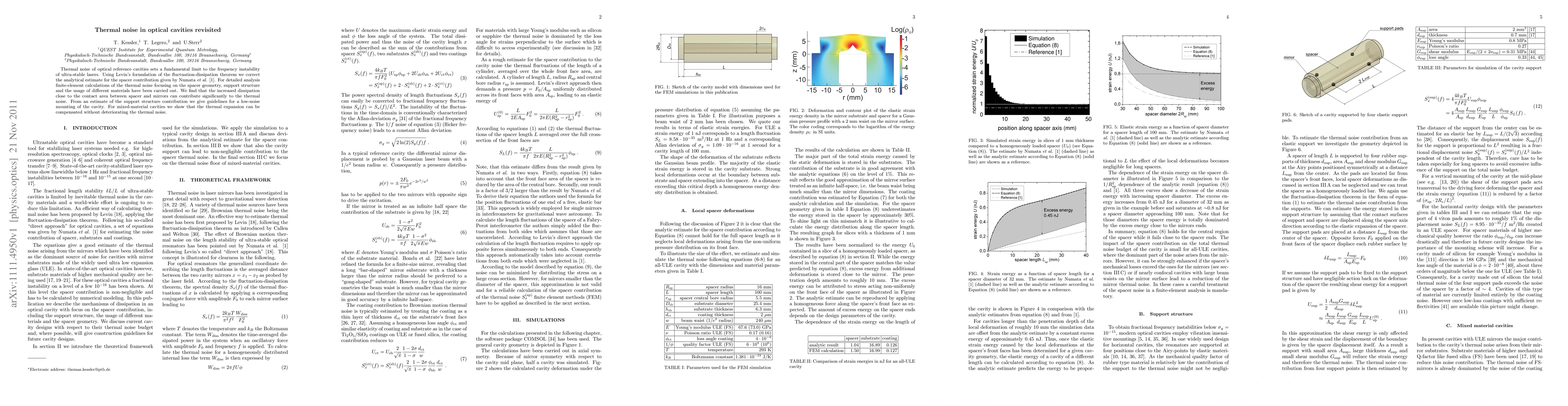 This paper revisits thermal noise in optical cavities, providing a corrected analytical estimate for spacer contributions using Levin's fluctuation-dissipation theorem. Finite-element calculations reveal that increased dissipation near the spacer-mirror contact area significantly impacts thermal noise, offering guidelines for low-noise cavity mounting.