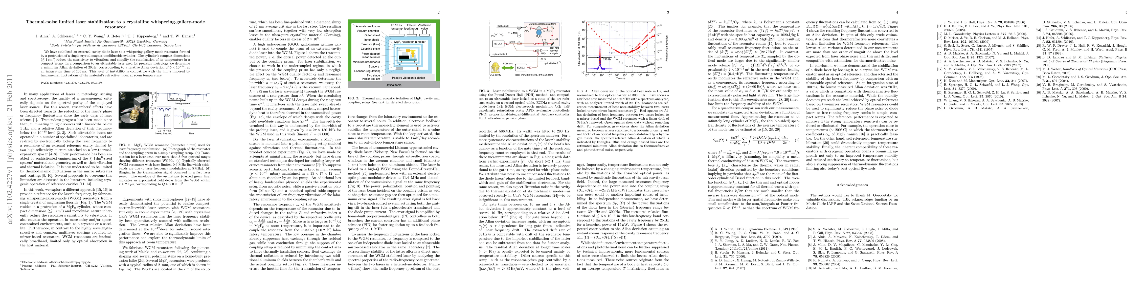 This paper details the stabilization of an external cavity diode laser to a whispering gallery mode resonator in a single-crystal magnesium difluoride cylinder, achieving a minimum Allan deviation of 20 Hz, demonstrating thermal-noise limited performance and compatibility with fundamental material fluctuation limits.