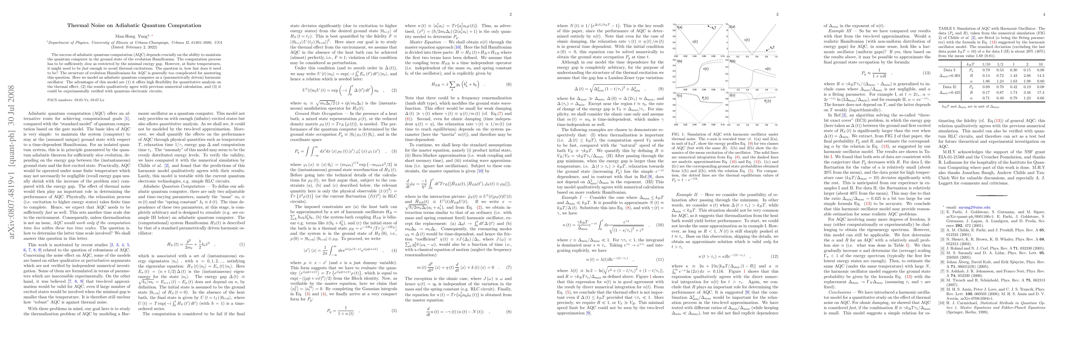 This paper investigates the impact of thermal noise on adiabatic quantum computation (AQC) by modeling the quantum computer as a parametrically driven harmonic oscillator, allowing for detailed quantitative analysis and experimental verification. The study finds that the computation process must be sufficiently fast to avoid thermal excitations at finite temperatures, balancing the need for a slow process to maintain the ground state.