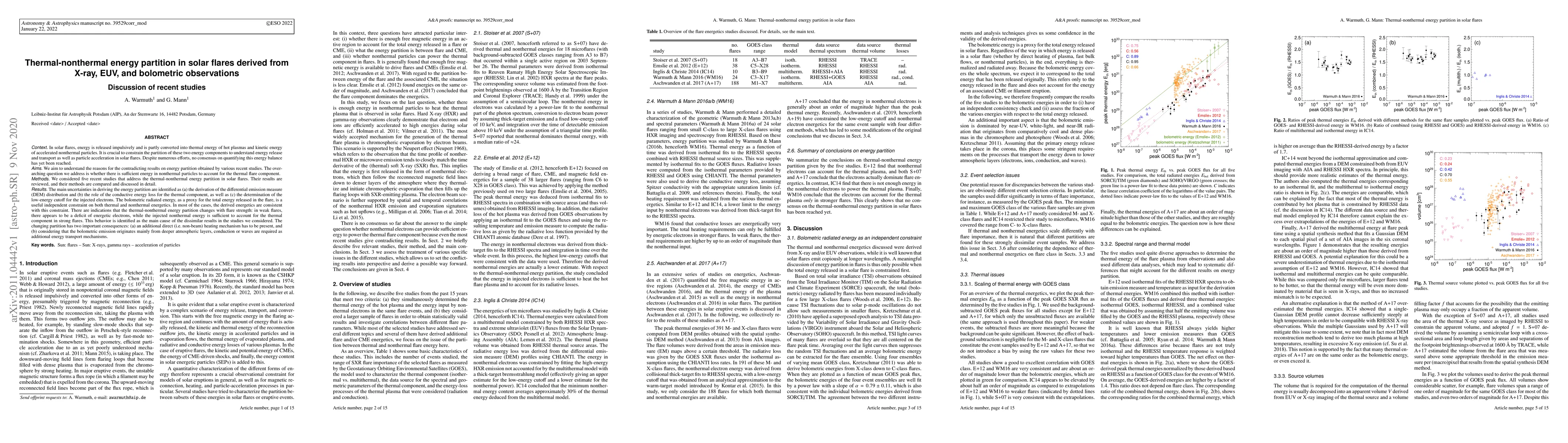 In solar flares, energy is released impulsively and is partly converted into thermal energy of hot plasmas and kinetic energy of accelerated nonthermal particles. Despite numerous efforts, no consensus on quantifying this energy balance has yet been reached. We aim to understand the reasons for the contradicting results on energy partition obtained by various recent studies. We considered five recent studies that address the thermal-nonthermal energy partition in solar flares. Their results are reviewed, and their methods are compared and discussed in detail. The main uncertainties in deriving the energy partition are identified as (a) the derivation of the differential emission measure (DEM) distribution and (b) the role of the conductive energy loss for the thermal component, as well as (c) the determination of the low-energy cutoff for the injected electrons. The bolometric radiated energy, as a proxy for the total energy released in the flare, is a useful independent constraint on both thermal and nonthermal energetics. In most of the cases, the derived energetics are consistent with this constraint. There are indications that the thermal-nonthermal energy partition changes with flare strength: in weak flares, there appears to be a deficit of energetic electrons, while the injected nonthermal energy is sufficient to account for the thermal component in strong flares. This behavior is identified as the main cause of the dissimilar results in the studies we considered. The changing partition has two important consequences: (a) an additional direct (i.e. non-beam) heating mechanism has to be present, and (b) considering that the bolometric emission originates mainly from deeper atmospheric layers, conduction or waves are required as additional energy transport mechanisms.