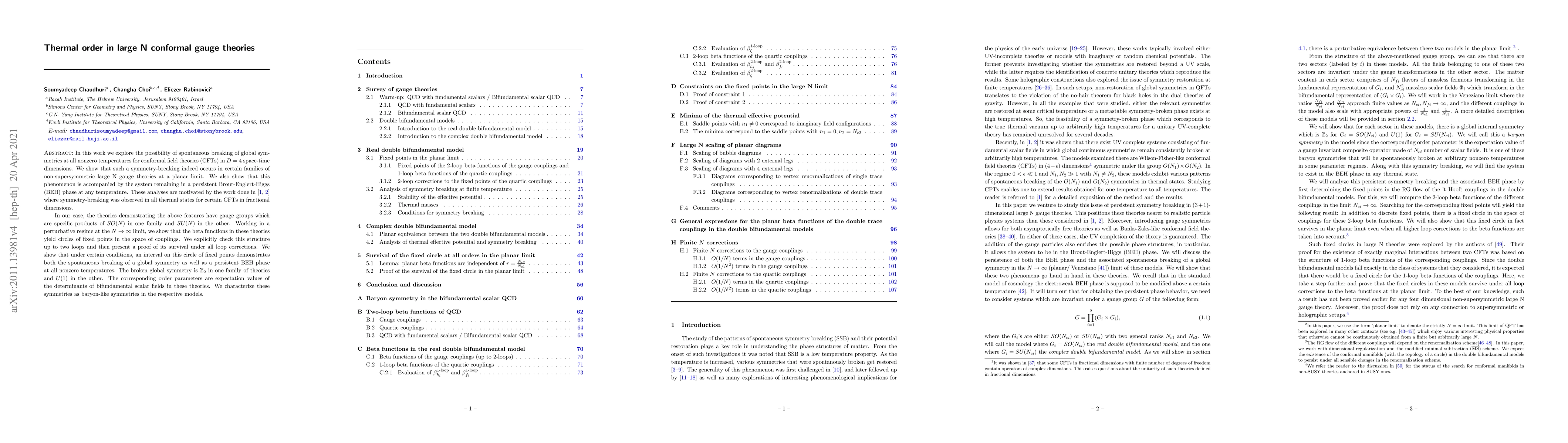 This research investigates spontaneous symmetry breaking in large $N$ conformal gauge theories in $D = 4$ dimensions, showing it persists at all nonzero temperatures in specific non-supersymmetric families with $SO(N)$ and $SU(N)$ gauge groups. The study confirms the presence of a persistent Brout-Englert-Higgs phase and identifies $\mathbb{Z}_2$ and $U(1)$ symmetries as baryon-like, with corresponding order parameters.