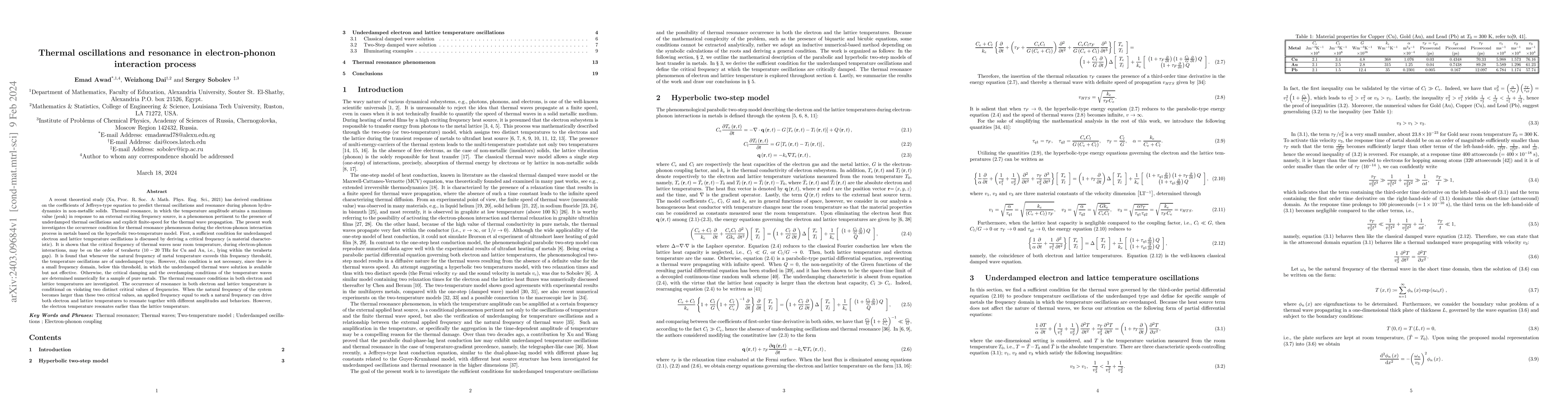 The paper explores the conditions for thermal resonance during electron-phonon interactions in metals using the hyperbolic two-temperature model, identifying a critical frequency for underdamped thermal oscillations and demonstrating that natural frequencies exceeding this threshold lead to resonant behavior in both electron and lattice temperatures, with electron temperature resonating first.