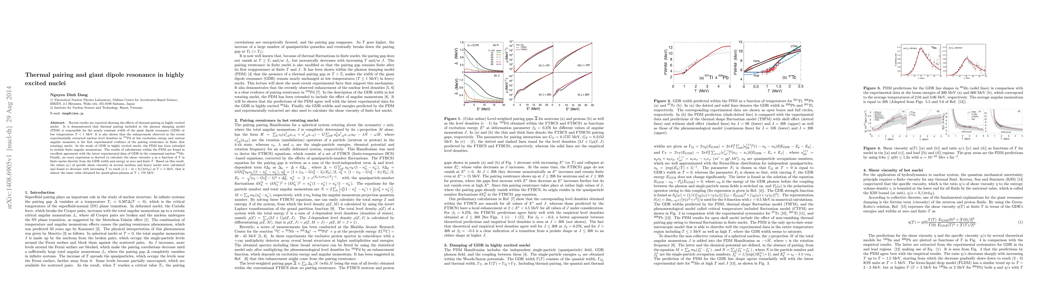 This paper investigates the impact of thermal pairing on the giant dipole resonance (GDR) in highly excited nuclei, demonstrating that thermal pairing in the phonon damping model (PDM) maintains GDR width at low temperatures. It provides experimental evidence for pairing reentrance in hot rotating nuclei and calculates shear viscosity $\eta/s$ in medium and heavy nuclei, finding it decreases with temperature and aligns with values in quark-gluon plasma.