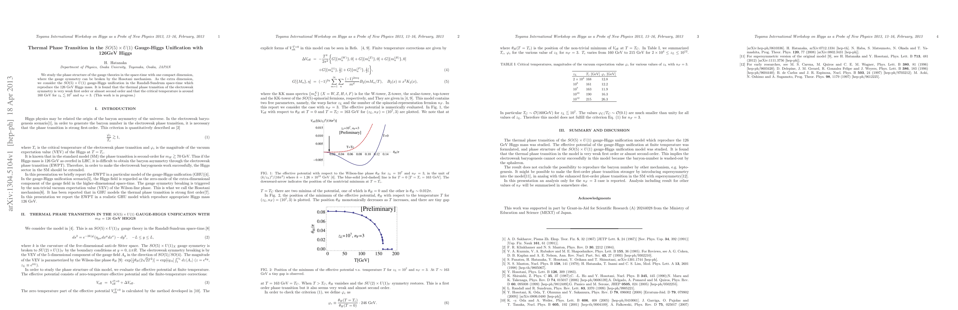 We study the phase structure of the gauge theories in the space-time with one compact dimension, where the gauge symmetry can be broken by the Hosotani mechanism. As the extra dimension, we consider the SO(5) x U(1) gauge-Higgs unification in the Randall-Sundrum space-time which reproduce the 126 GeV Higgs mass. It is found that the thermal phase transition of the electroweak symmetry is almost second order and the critical temperature is around 160 GeV for z_L < 10^7 and n_F=3.