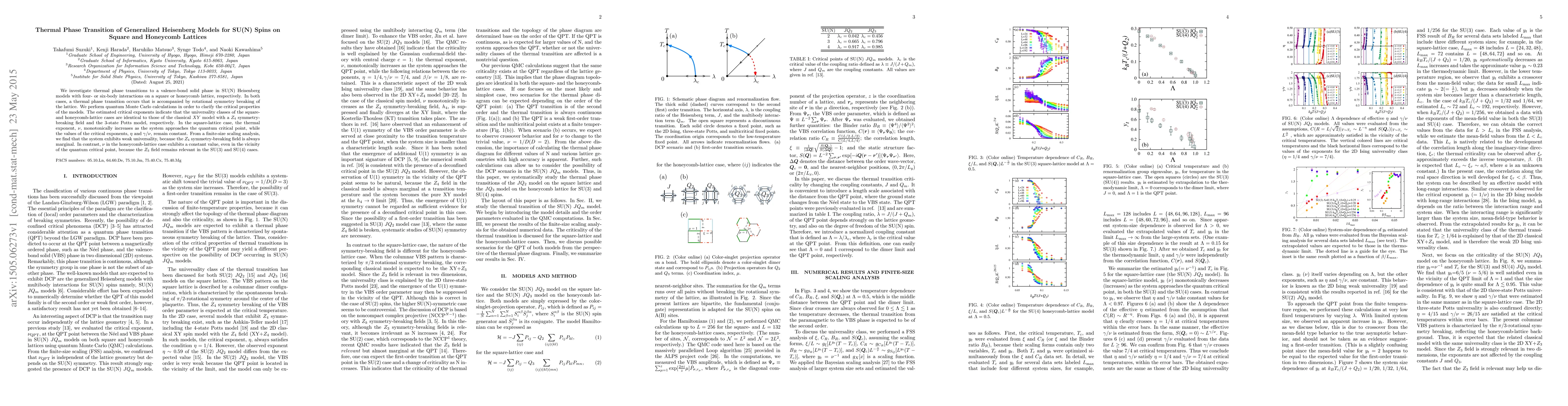 This paper investigates thermal phase transitions in SU(N) Heisenberg models on square and honeycomb lattices, revealing symmetry breaking and critical properties. Quantum Monte Carlo calculations show that the square-lattice model's critical exponents align with the classical $XY$ model, while the honeycomb-lattice model's critical behavior matches the 3-state Potts model, indicating weak universality due to marginal symmetry-breaking fields.