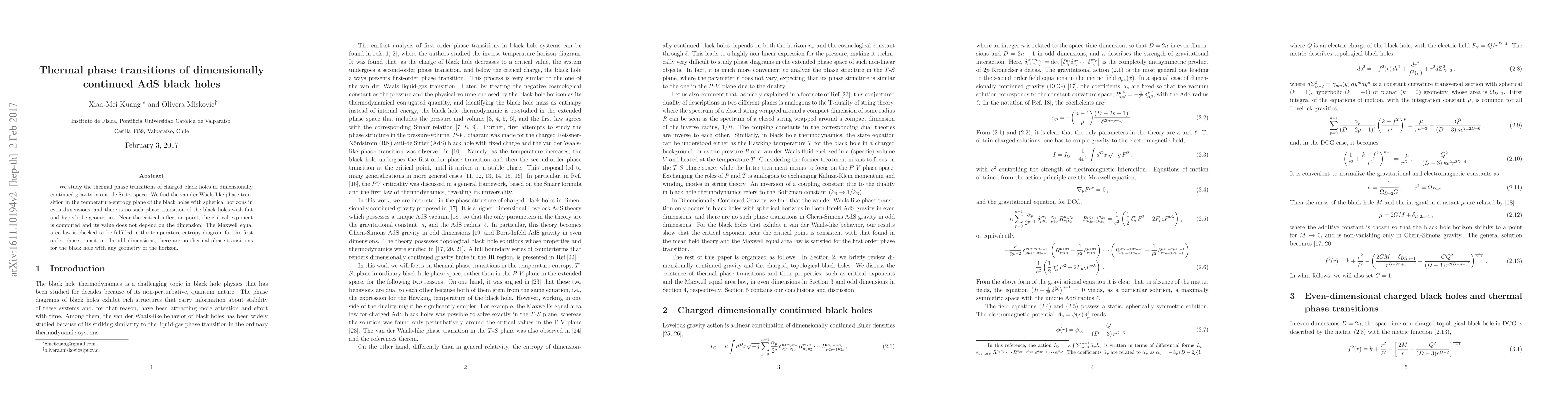 This paper investigates thermal phase transitions in dimensionally continued AdS black holes, revealing van der Waals-like behavior in even dimensions with spherical horizons, while no such transitions occur in odd dimensions or for flat and hyperbolic geometries. The critical exponent remains dimension-independent, and the Maxwell equal area law holds for the first-order phase transition.