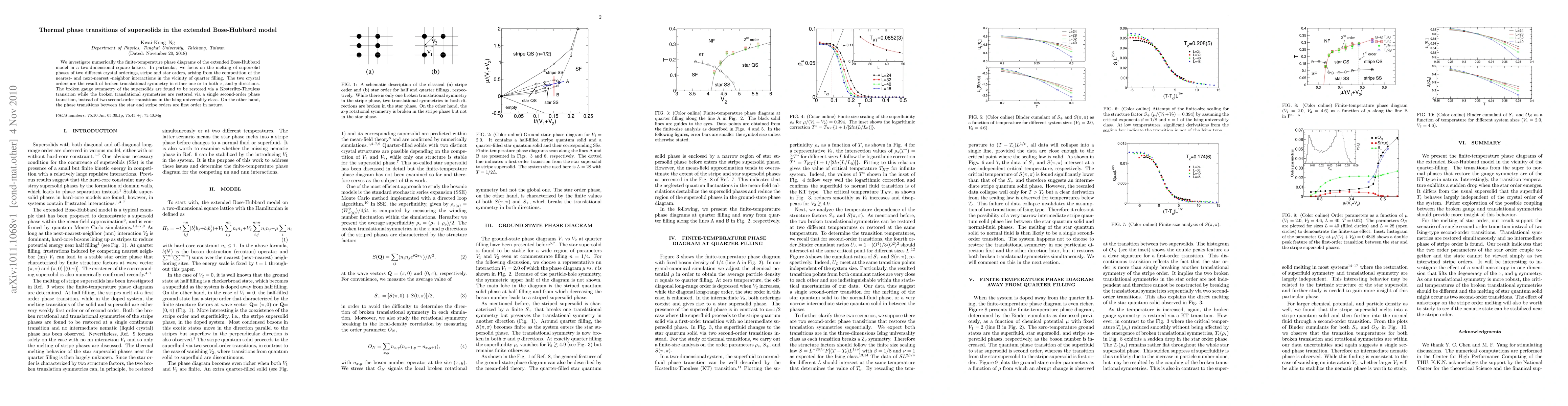 This paper numerically explores the thermal phase transitions in the extended Bose-Hubbard model, focusing on the melting of supersolid phases with stripe and star orderings. The study reveals that the broken gauge symmetry of the supersolids is restored via a Kosterlitz-Thouless transition, while the broken translational symmetries undergo a single second-order transition, contrasting with the expected Ising universality class.