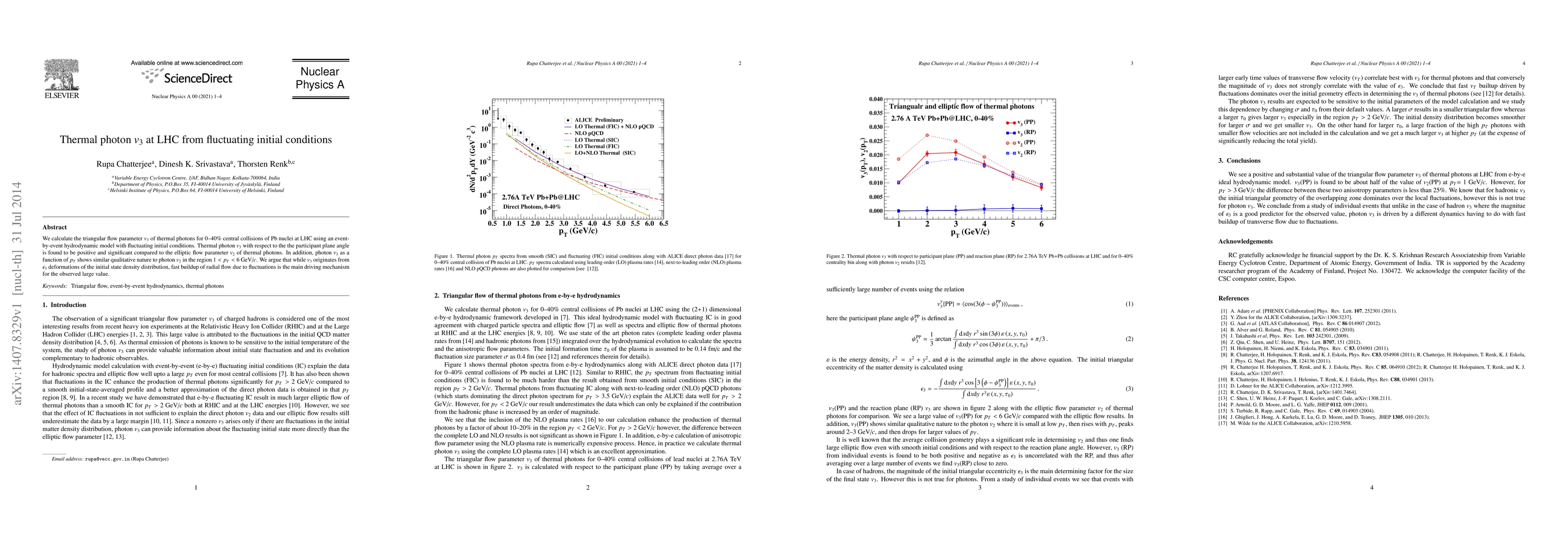 Researchers calculated the triangular flow parameter $v_3$ of thermal photons in LHC collisions, finding it to be positive and significant compared to $v_2$, with a driving mechanism attributed to radial flow buildup due to fluctuations.