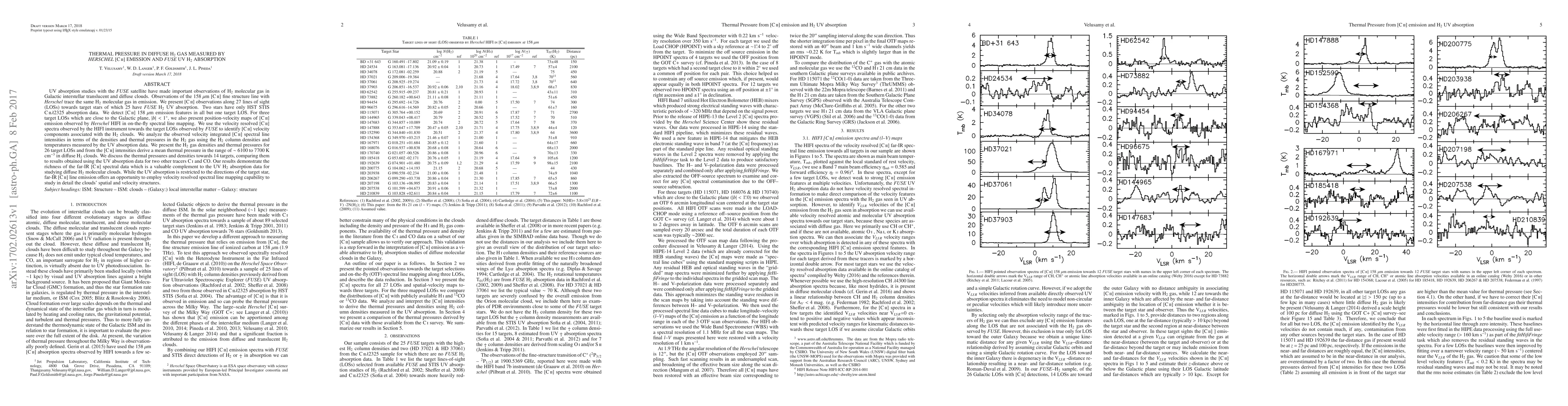 This paper measures thermal pressures in diffuse H2 gas using Herschel's [C II] emission and FUSE UV H2 absorption data. The study finds a mean thermal pressure of 6100 to 7700 K cm^-3 in these clouds, comparing these results with other tracers like CI and CO.