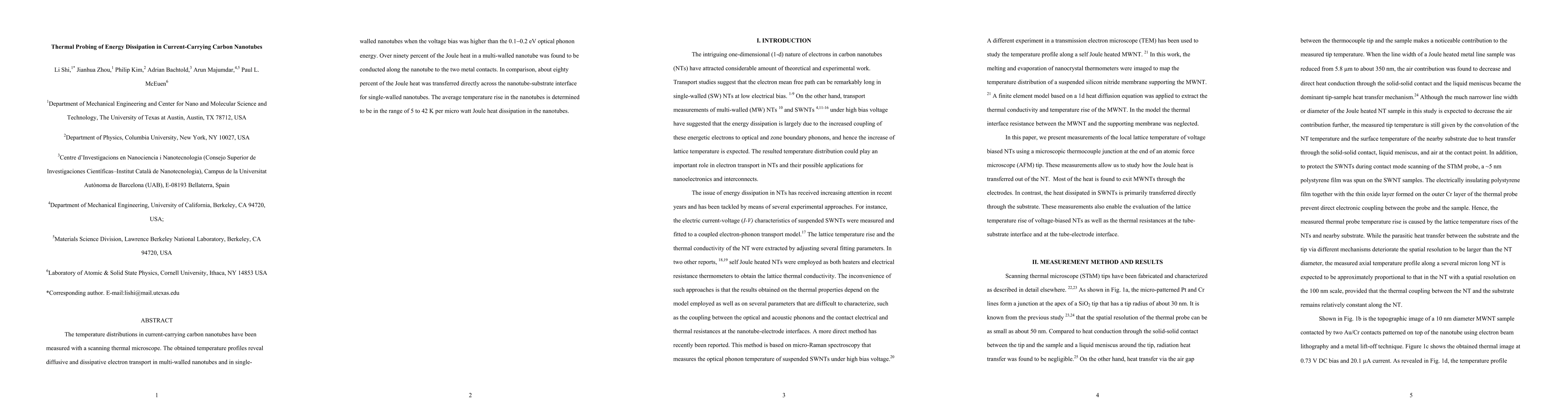 Researchers used a scanning thermal microscope to measure temperature distributions in current-carrying carbon nanotubes, finding that most of the Joule heat is conducted along the nanotube or transferred directly across the substrate interface.