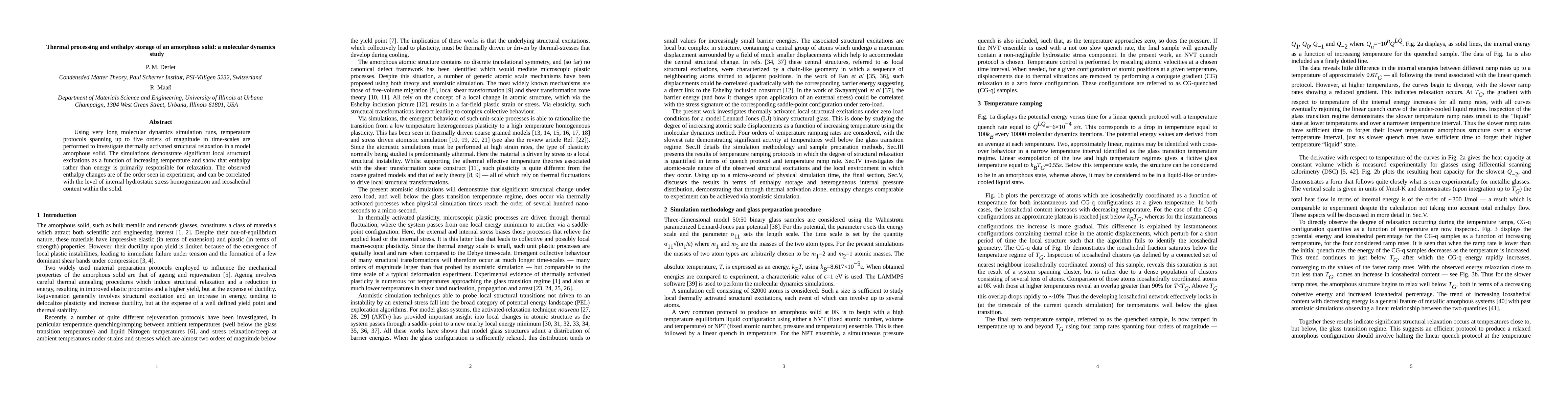 Using very long molecular dynamics simulation runs, temperature protocols spanning up to five orders of magnitude in time-scales are performed to investigate thermally activated structural relaxation in a model amorphous solid. The simulations demonstrate significant local structural excitations as a function of increasing temperature and show that enthalpy rather than energy is primarily responsible for relaxation. The observed enthalpy changes are of the order seen in experiment, and can be correlated with the level of internal hydrostatic stress homogenization and icosahedral content within the solid.