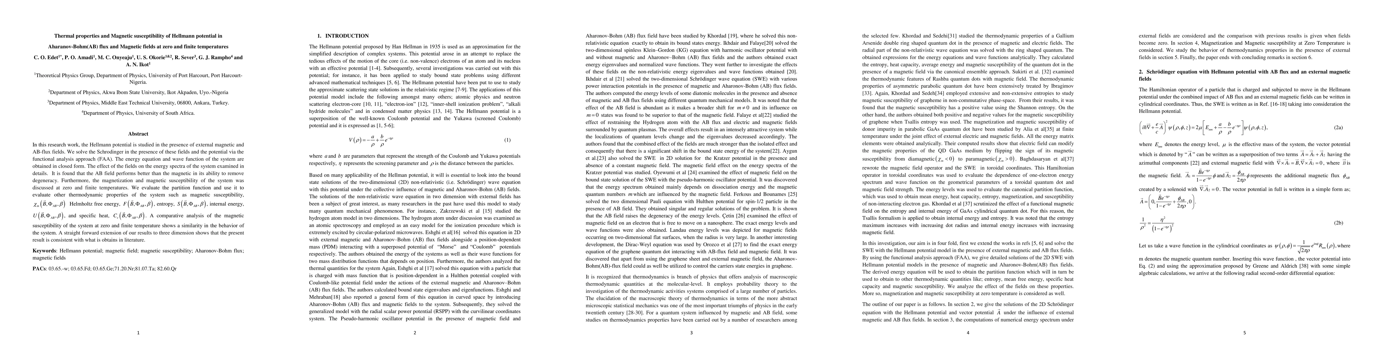 In this research work, the Hellmann potential is studied in the presence of external magnetic and AB-flux fields. We solve the Schrodinger in the presence of these fields and the potential via the functional analysis approach (FAA). The energy equation and wave function of the system are obtained in closed form. The effect of the fields on the energy spectra of the system examined in details. It is found that the AB field performs better than the magnetic in its ability to remove degeneracy. Furthermore, the magnetization and magnetic susceptibility of the system was discussed at zero and finite temperatures. We evaluate the partition function and use it to evaluate other thermodynamic properties of the system such as magnetic susceptibility, Helmholtz free energy,entropy, internal energy and specific heat. A comparative analysis of the magnetic susceptibility of the system at zero and finite temperature shows a similarity in the behavior of the system. A straight forward extension of our results to three dimension shows that the present result is consistent with what is obtains in literature.