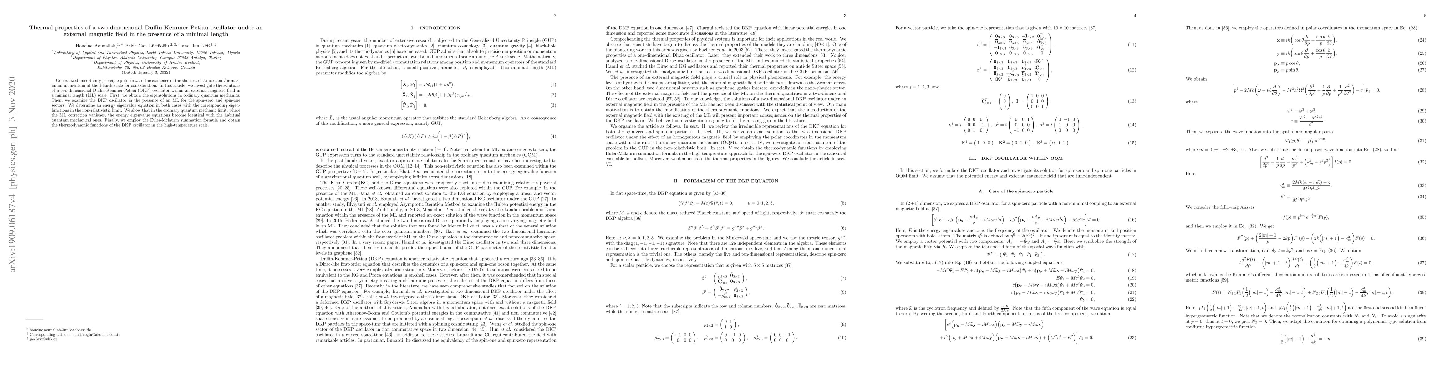 This paper investigates the thermal properties of a two-dimensional Duffin-Kemmer-Petiau oscillator subjected to an external magnetic field, incorporating the concept of minimal length. It derives the energy eigenvalue equations and eigenfunctions, demonstrating that ordinary quantum mechanics results emerge when minimal length corrections vanish.