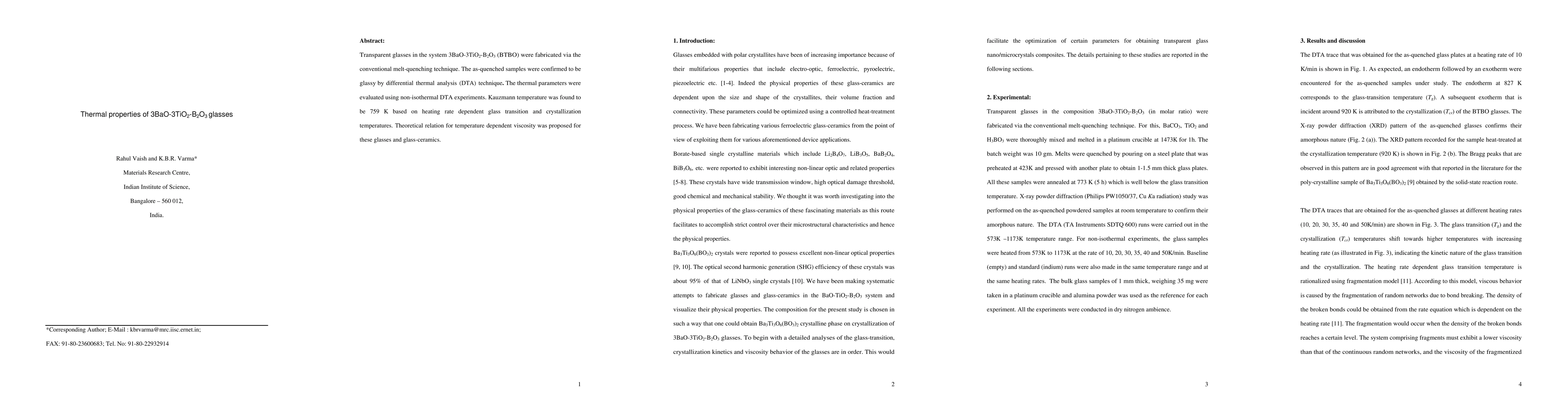 Transparent glasses in the system 3BaO-3TiO2-B2O3 (BTBO) were fabricated via the conventional melt-quenching technique. The as-quenched samples were confirmed to be glassy by differential thermal analysis (DTA) technique. The thermal parameters were evaluated using non-isothermal DTA experiments. Kauzmann temperature was found to be 759 K based on heating rate dependent glass transition and crystallization temperatures. Theoretical relation for temperature dependent viscosity was proposed for these glasses and glass-ceramics.