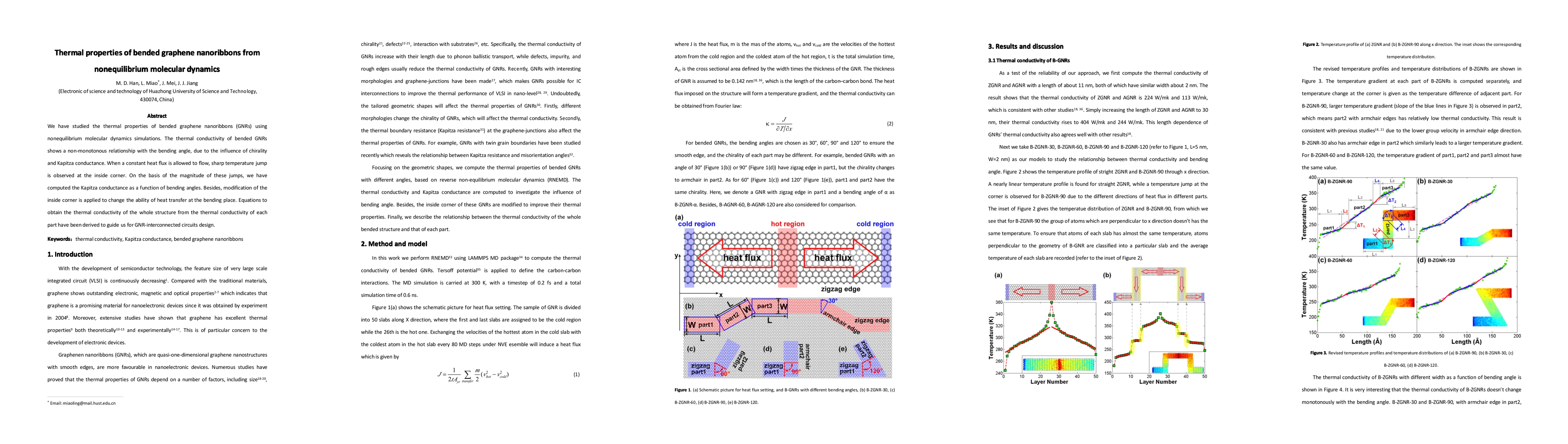 This paper investigates the thermal conductivity of bended graphene nanoribbons via nonequilibrium molecular dynamics, revealing a non-monotonic relationship with bending angle influenced by chirality and Kapitza conductance. It also identifies sharp temperature jumps at inside corners and derives equations for thermal conductivity in GNR-interconnected circuits.