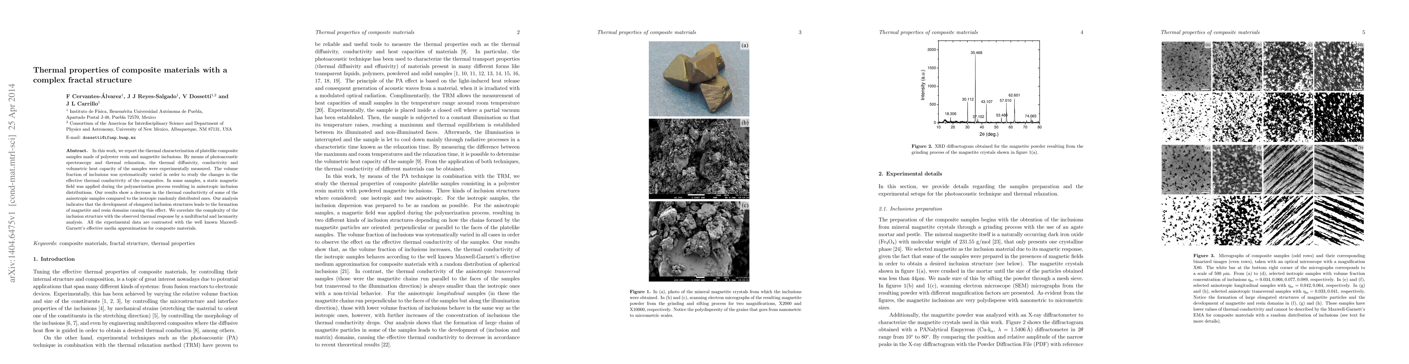 In this work, we report the thermal characterization of platelike composite samples made of polyester resin and magnetite inclusions. By means of photoacoustic spectroscopy and thermal relaxation, the thermal diffusivity, conductivity and volumetric heat capacity of the samples were experimentally measured. The volume fraction of inclusions was systematically varied in order to study the changes in the effective thermal conductivity of the composites. In some samples, a static magnetic field was applied during the polymerization process resulting in anisotropic inclusion distributions. Our results show a decrease in the thermal conductivity of some of the anisotropic samples compared to the isotropic randomly distributed ones. Our analysis indicates that the development of elongated inclusion structures leads to the formation of magnetite and resin domains causing this effect. We correlate the complexity of the inclusion structure with the observed thermal response by a multifractal and lacunarity analysis. All the experimental data are contrasted with the well known Maxwell-Garnett's effective media approximation for composite materials.