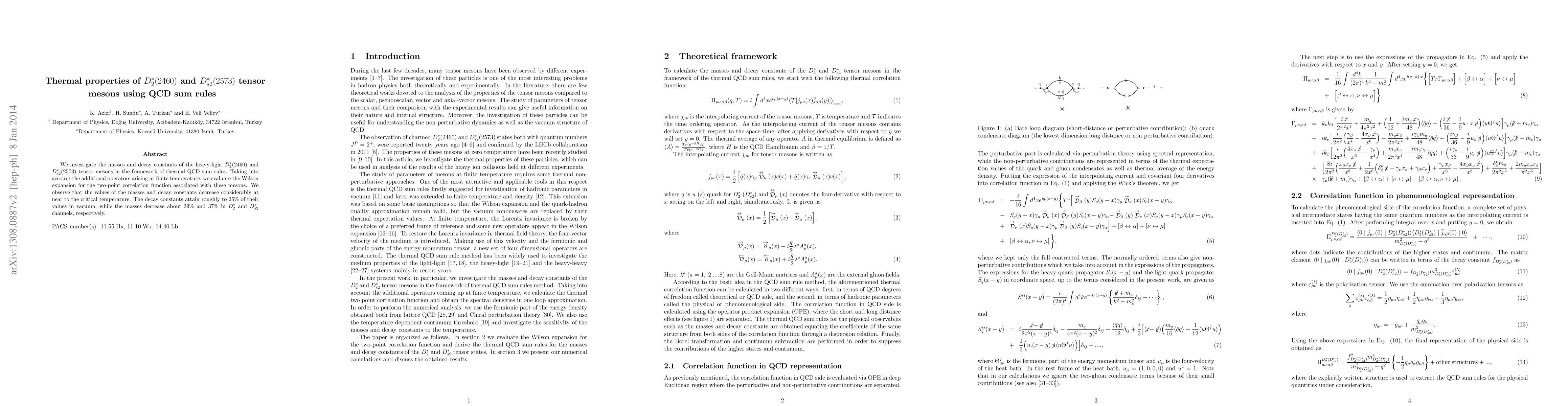 We investigate the masses and decay constants of the heavy-light $D_2^*(2460)$ and $D_{s2}^*(2573)$ tensor mesons in the framework of thermal QCD sum rules. Taking into account the additional operators arising at finite temperature, we evaluate the Wilson expansion for the two-point correlation function associated with these mesons. We observe that the values of the masses and decay constants decrease considerably at near to the critical temperature. The decay constants attain roughly to $25\%$ of their values in vacuum, while the masses decrease about $39\%$ and $37\%$ in $D_2^*$ and $D_{s2}^*$ channels, respectively.