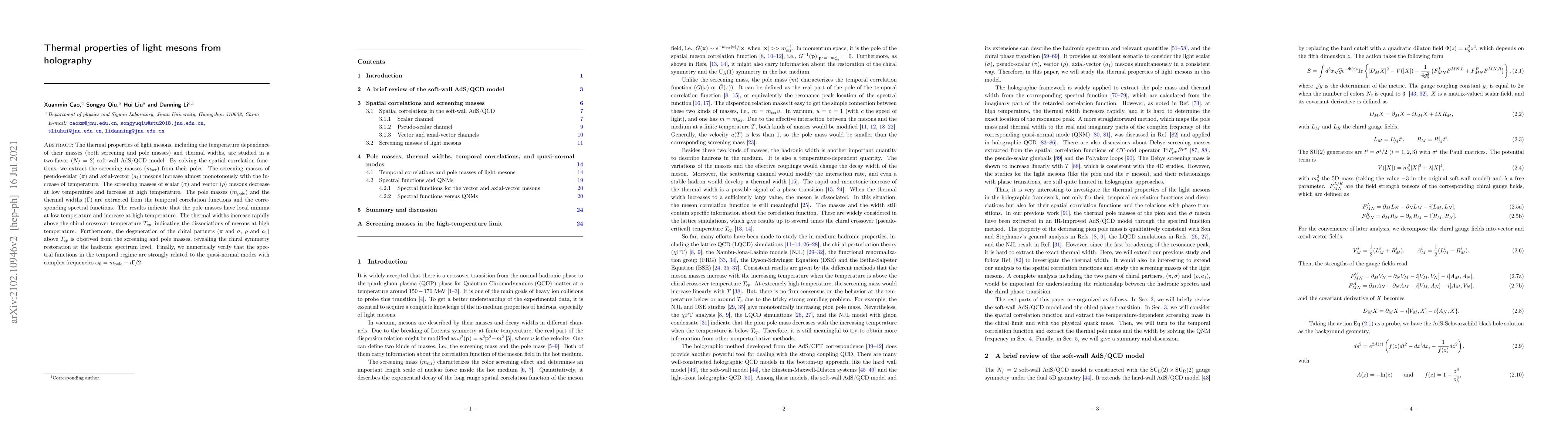 This study uses a soft-wall AdS/QCD model to analyze the thermal properties of light mesons, revealing that their screening masses increase with temperature, while pole masses have local minima and increase at high temperatures. Thermal widths show rapid growth above the chiral crossover temperature, indicating meson dissociation.