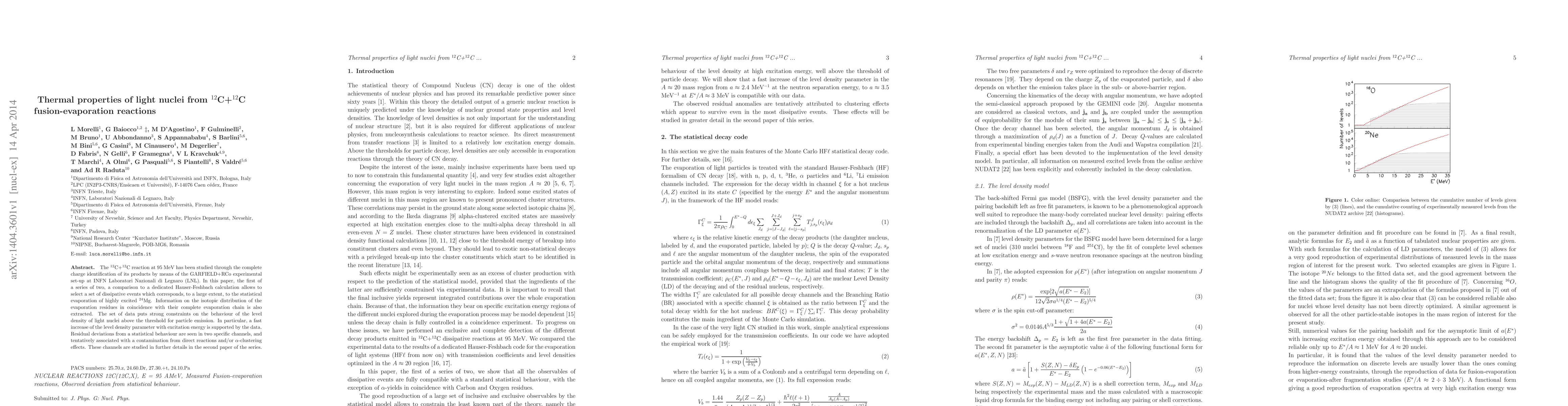 Researchers studied the fusion-evaporation reaction of $^{12}$C+$^{12}$C at 95 MeV to understand thermal properties of light nuclei. They found a fast increase in level density parameter with excitation energy, supported by data, but with some residual deviations that may be due to direct reactions and/or $eta$-clustering effects.
