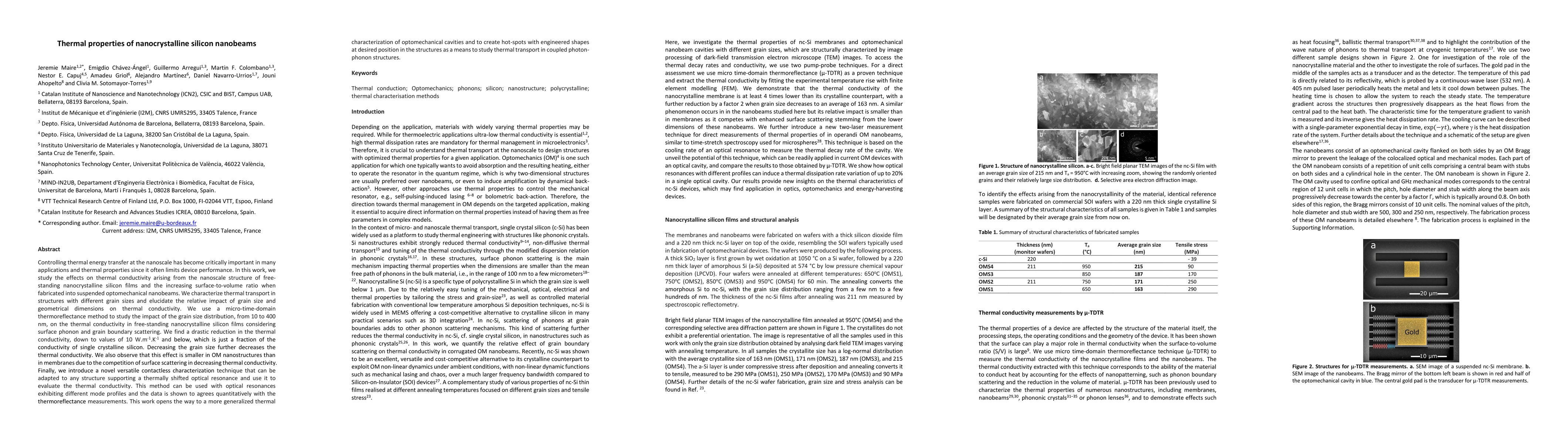 This research investigates how the nanoscale structure and grain size of nanocrystalline silicon films affect thermal conductivity, finding significant reductions due to grain boundary scattering. The study also highlights that optomechanical nanobeams exhibit less thermal conductivity reduction compared to membranes due to surface scattering effects, and introduces a novel contactless thermoreflectance method for thermal characterization, applicable to various optomechanical structures.