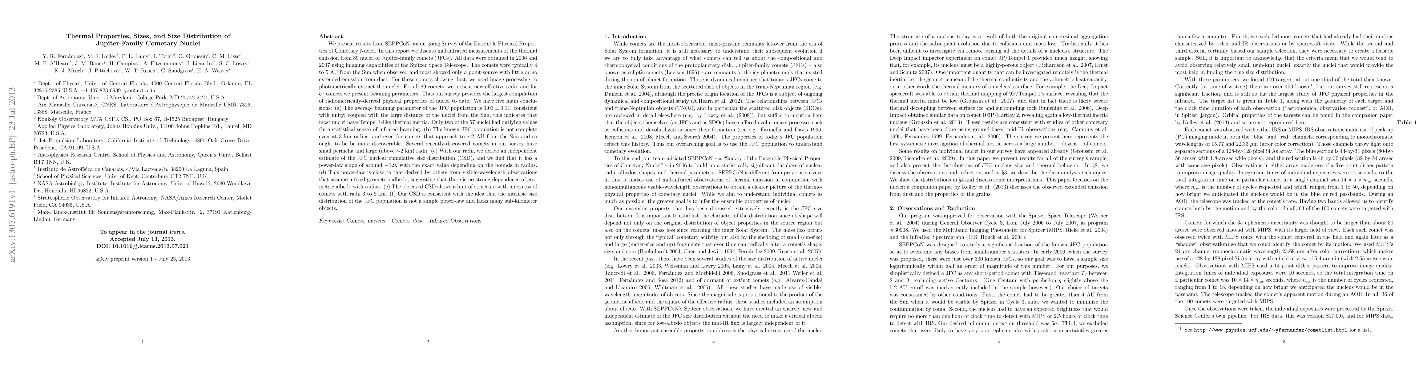 The study of Jupiter-family comets reveals that their nuclei have low thermal inertia, a power-law size distribution with a slope of -1.9, and lack many small objects, consistent with an intrinsic distribution.