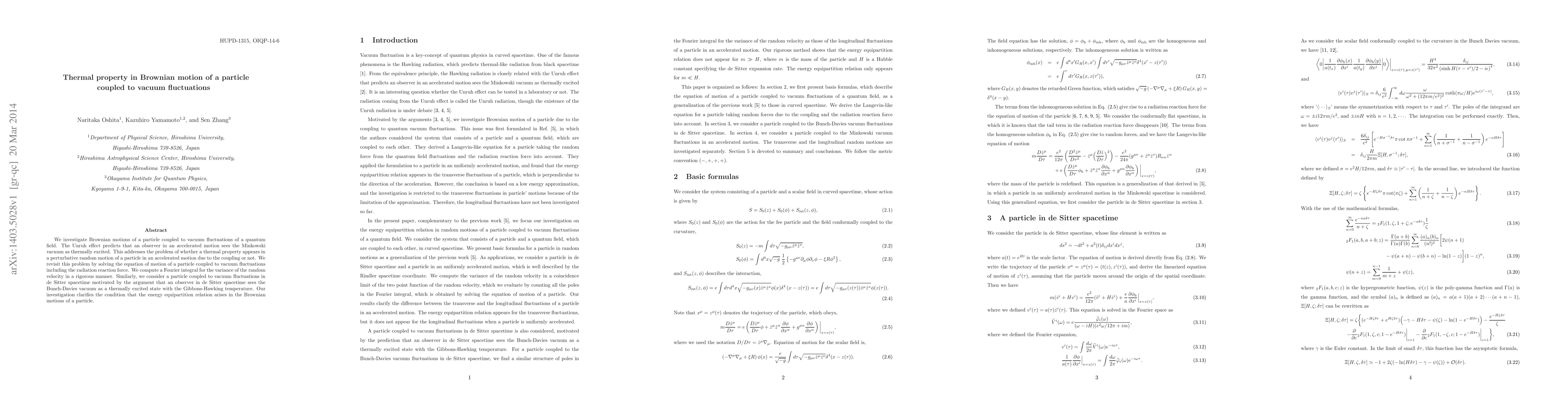 We investigate Brownian motions of a particle coupled to vacuum fluctuations of a quantum field. The Unruh effect predicts that an observer in an accelerated motion sees the Minkowski vacuum as thermally excited. This addresses the problem of whether a thermal property appears in a perturbative random motion of a particle in an accelerated motion due to the coupling or not. We revisit this problem by solving the equation of motion of a particle coupled to vacuum fluctuations including the radiation reaction force. We compute a Fourier integral for the variance of the random velocity in a rigorous manner. Similarly, we consider a particle coupled to vacuum fluctuations in de Sitter spacetime motivated by the argument that an observer in de Sitter spacetime sees the Bunch-Davies vacuum as a thermally excited state with the Gibbons-Hawking temperature. Our investigation clarifies the condition that the energy equipartition relation arises in the Brownian motions of a particle.