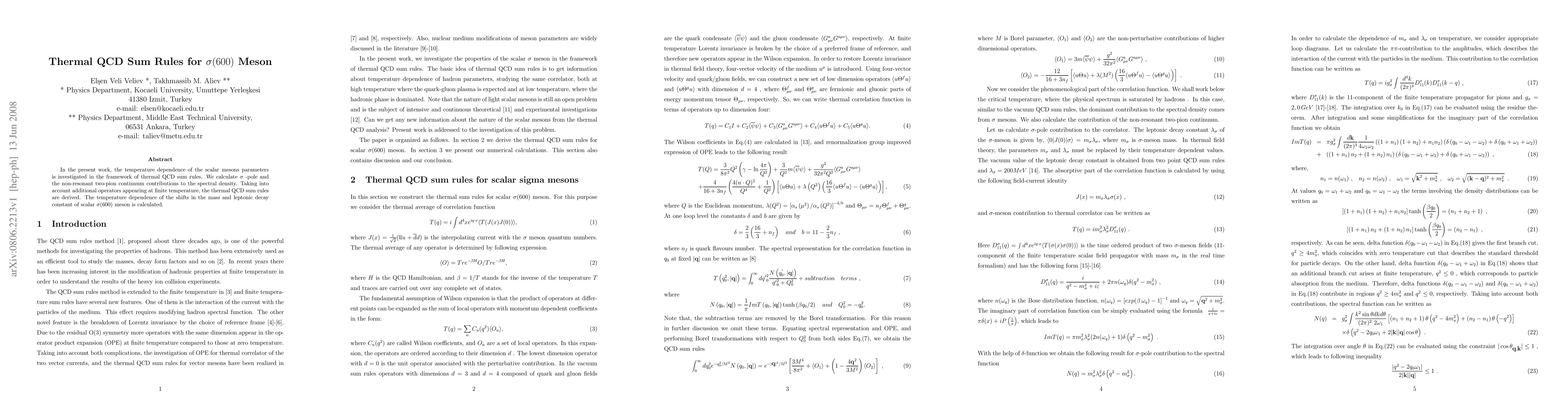 This paper investigates the temperature dependence of the scalar meson parameters using thermal QCD sum rules, calculating sigma-pole and non-resonant two-pion contributions. It derives thermal QCD sum rules and computes shifts in the mass and leptonic decay constant of the sigma(600) meson with increasing temperature.