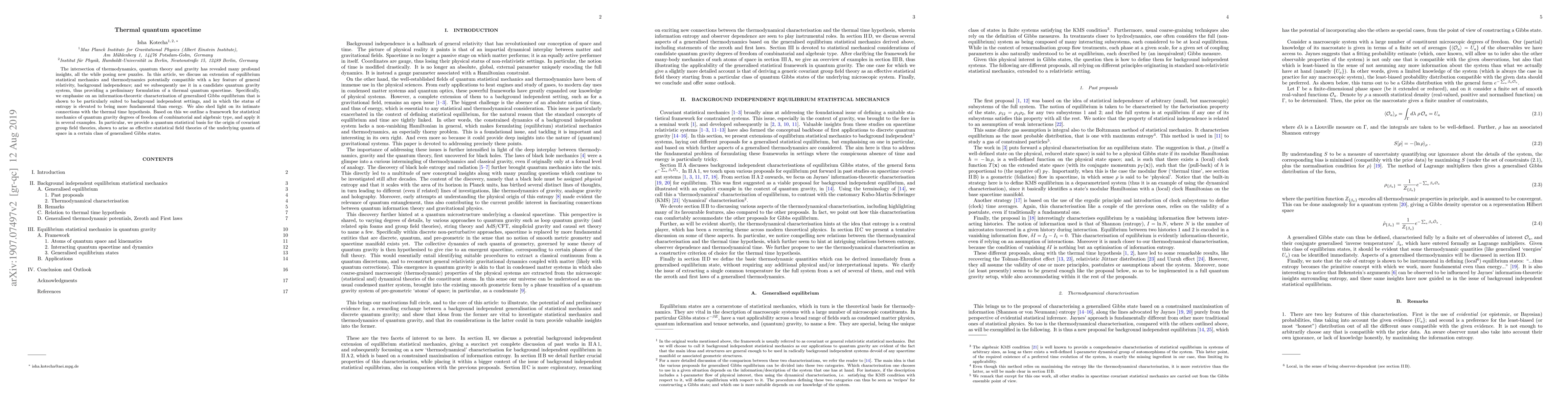 This paper proposes an extension of equilibrium statistical mechanics compatible with general relativity's background independence, elevating entropy's fundamental role over energy. It introduces a thermal quantum spacetime framework, using information theory to describe generalised Gibbs equilibrium and its connection to the thermal time hypothesis, and applies it to derive covariant group field theories as effective statistical field theories of quantum gravity.