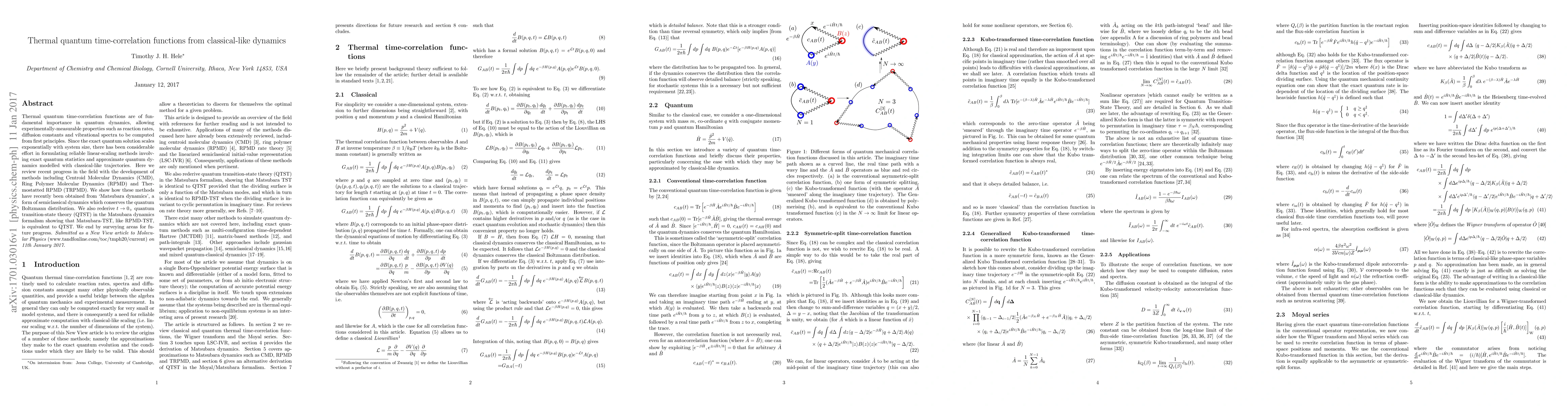 Thermal quantum time-correlation functions are of fundamental importance in quantum dynamics, allowing experimentally-measurable properties such as reaction rates, diffusion constants and vibrational spectra to be computed from first principles. Since the exact quantum solution scales exponentially with system size, there has been considerable effort in formulating reliable linear-scaling methods involving exact quantum statistics and approximate quantum dynamics modelled with classical-like trajectories. Here we review recent progress in the field with the development of methods including Centroid Molecular Dynamics (CMD), Ring Polymer Molecular Dynamics (RPMD) and Thermostatted RPMD (TRPMD). We show how these methods have recently been obtained from `Matsubara dynamics', a form of semiclassical dynamics which conserves the quantum Boltzmann distribution. We also rederive t->0+ quantum transition-state theory (QTST) in the Matsubara dynamics formalism showing that Matsubara-TST, like RPMD-TST, is equivalent to QTST. We end by surveying areas for future progress.
