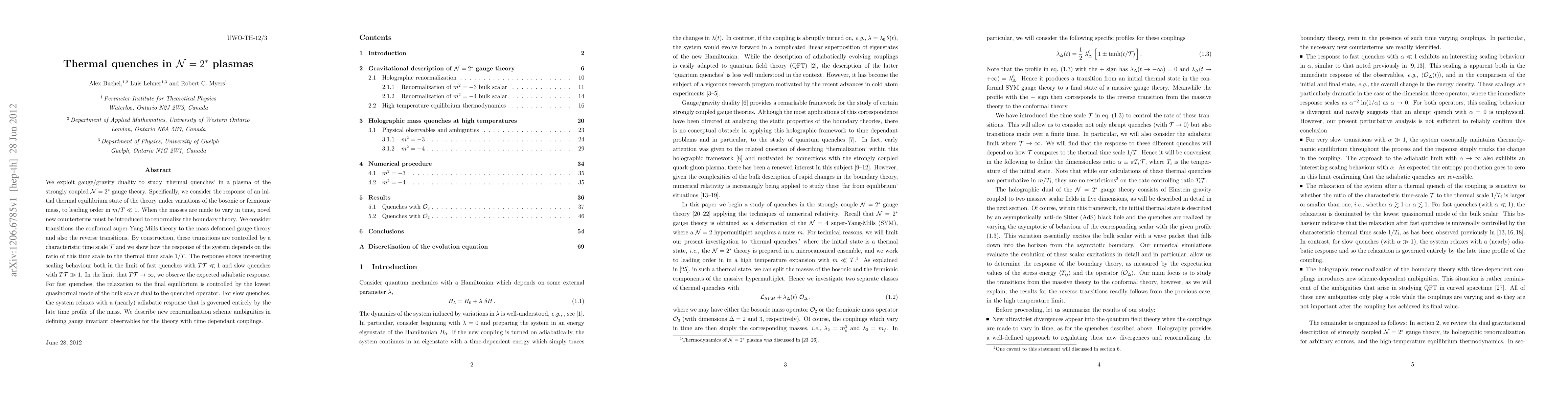 We exploit gauge/gravity duality to study `thermal quenches' in a plasma of the strongly coupled N=2* gauge theory. Specifically, we consider the response of an initial thermal equilibrium state of the theory under variations of the bosonic or fermionic mass, to leading order in m/T<<1. When the masses are made to vary in time, novel new counterterms must be introduced to renormalize the boundary theory. We consider transitions the conformal super-Yang-Mills theory to the mass deformed gauge theory and also the reverse transitions. By construction, these transitions are controlled by a characteristic time scale \calt and we show how the response of the system depends on the ratio of this time scale to the thermal time scale 1/T. The response shows interesting scaling behaviour both in the limit of fast quenches with T\calt<<1 and slow quenches with T\calt>>1. In the limit that T\calt\to\infty, we observe the expected adiabatic response. For fast quenches, the relaxation to the final equilibrium is controlled by the lowest quasinormal mode of the bulk scalar dual to the quenched operator. For slow quenches, the system relaxes with a (nearly) adiabatic response that is governed entirely by the late time profile of the mass. We describe new renormalization scheme ambiguities in defining gauge invariant observables for the theory with time dependant couplings.