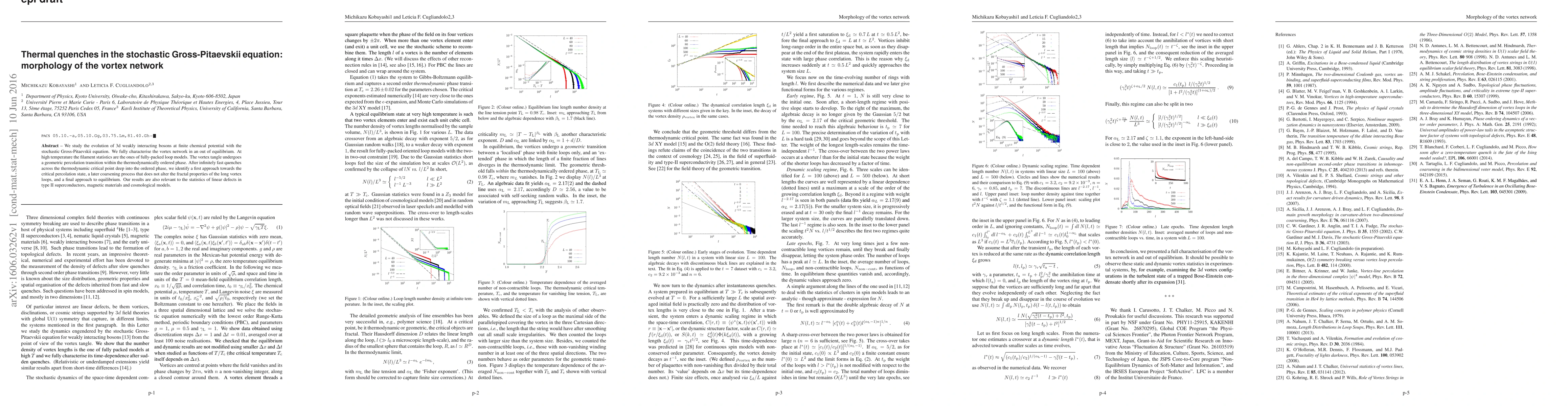 This paper investigates the vortex network morphology in 3D weakly interacting bosons using the stochastic Gross-Pitaevskii equation, revealing a geometric percolation transition and identifying stages in the evolution following thermal quenches, including coarsening and eventual equilibrium. The findings are applicable to defects in superconductors, magnetic materials, and cosmological models.