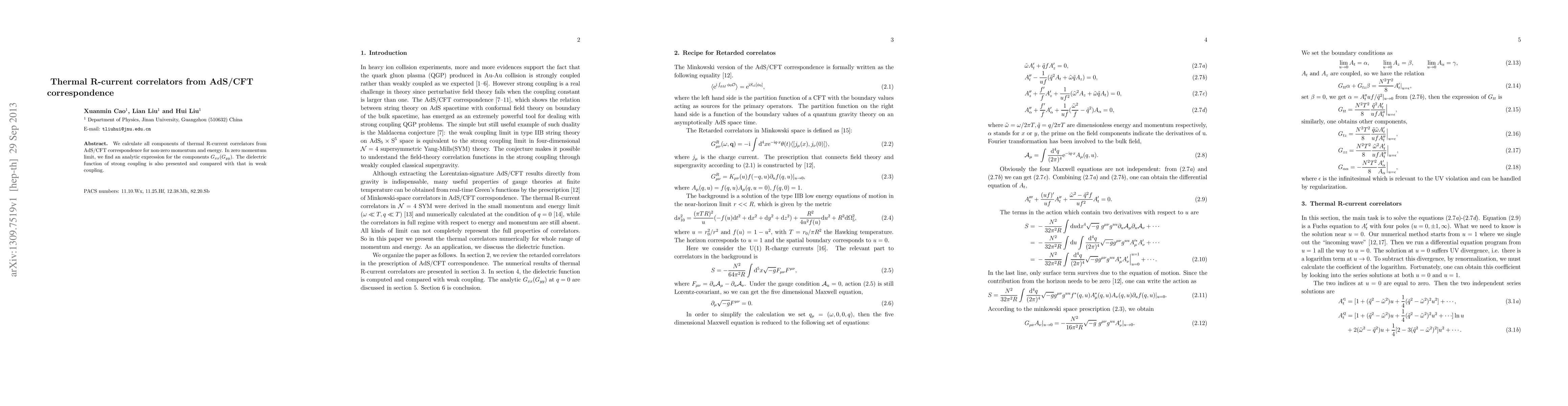 We calculate all components of thermal R-current correlators from AdS/CFT correspondence for non-zero momentum and energy. In zero momentum limit, we find an analytic expression for the components Gxx(Gyy). The dielectric function of strong coupling is also presented and compared with that in weak coupling.