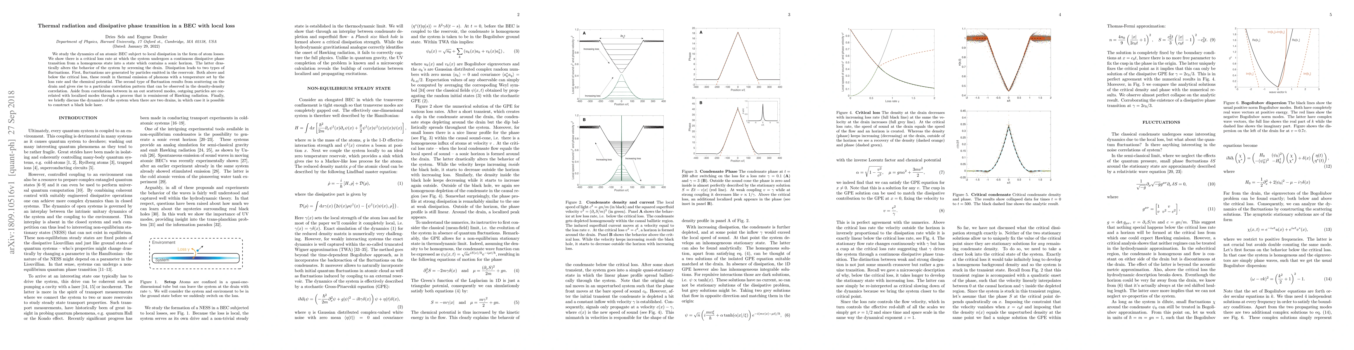 We study the dynamics of an atomic BEC subject to local dissipation in the form of atom losses. We show there is a critical loss rate at which the system undergoes a continuous dissipative phase transition from a homogenous state into a state which contains a sonic horizon. The latter drastically alters the behavior of the system by screening the drain. Dissipation leads to two types of fluctuations. First, fluctuations are generated by particles emitted in the reservoir. Both above and below the critical loss, these result in thermal emission of phonons with a temperature set by the loss rate and the chemical potential. The second type of fluctuation results from scattering on the drain and gives rise to a particular correlation pattern that can be observed in the density-density correlation. Aside from correlations between in an out scattered modes, outgoing particles are correlated with localized modes through a process that is reminiscent of Hawking radiation. Finally, we briefly discuss the dynamics of the system when there are two drains, in which case it is possible to construct a black hole laser.