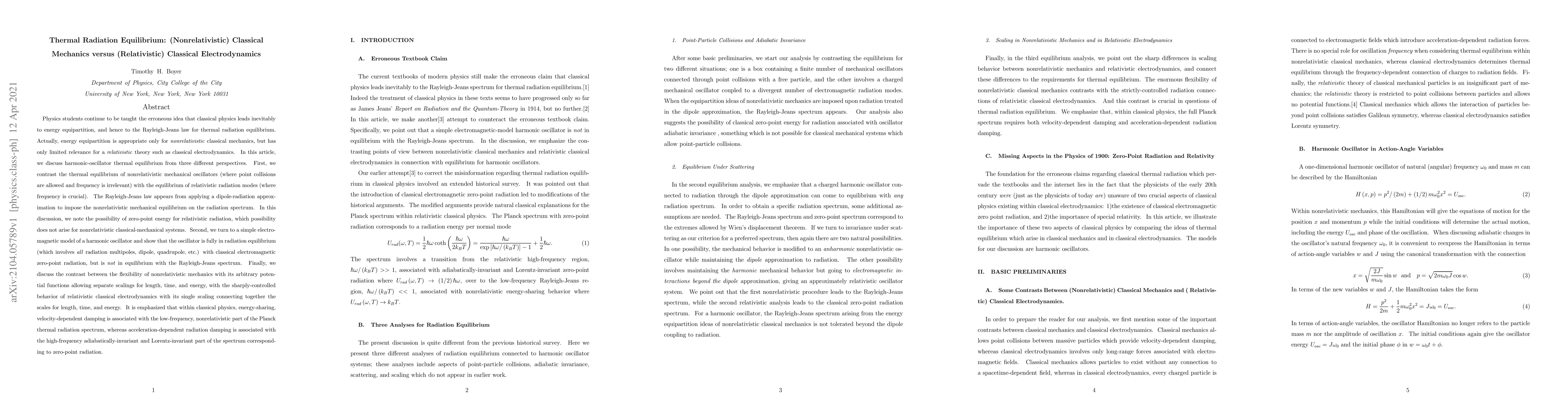 This paper contrasts thermal equilibrium in nonrelativistic classical mechanics and relativistic classical electrodynamics, highlighting the differences in energy equipartition and the relevance of frequency. It shows that while nonrelativistic oscillators follow the Rayleigh-Jeans law, relativistic radiation modes do not, and discusses the implications of zero-point energy in the context of classical electrodynamics.
