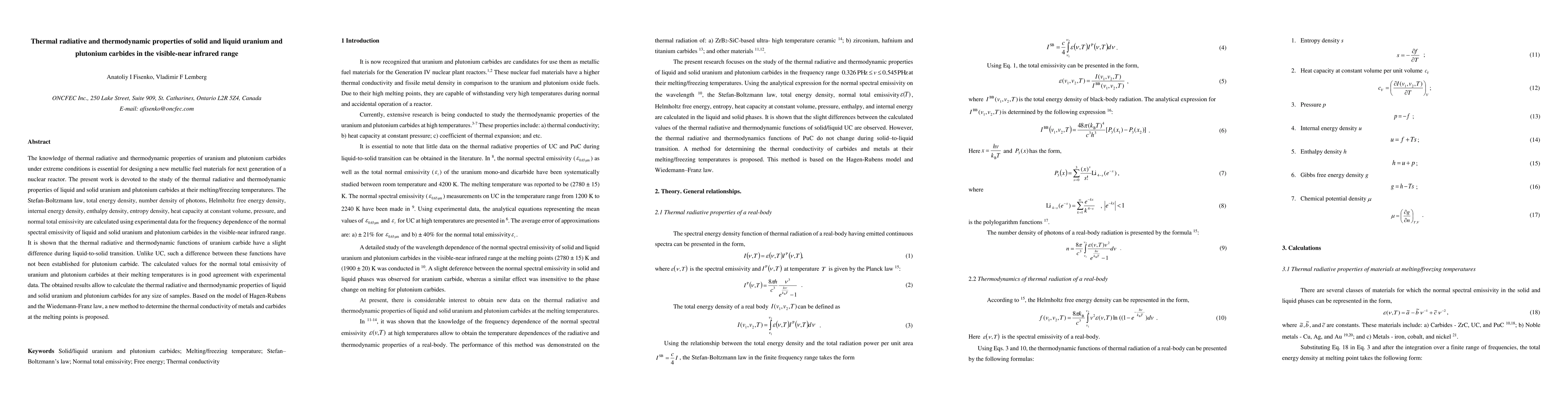This paper investigates the thermal radiative and thermodynamic properties of uranium and plutonium carbides in solid and liquid states at their melting/freezing temperatures. It provides comprehensive calculations of various thermodynamic functions, demonstrating slight differences in uranium carbide during phase transition, while no such differences are established for plutonium carbide. The study proposes a new method to determine thermal conductivity based on the Hagen-Rubens and Wiedemann-Franz laws.