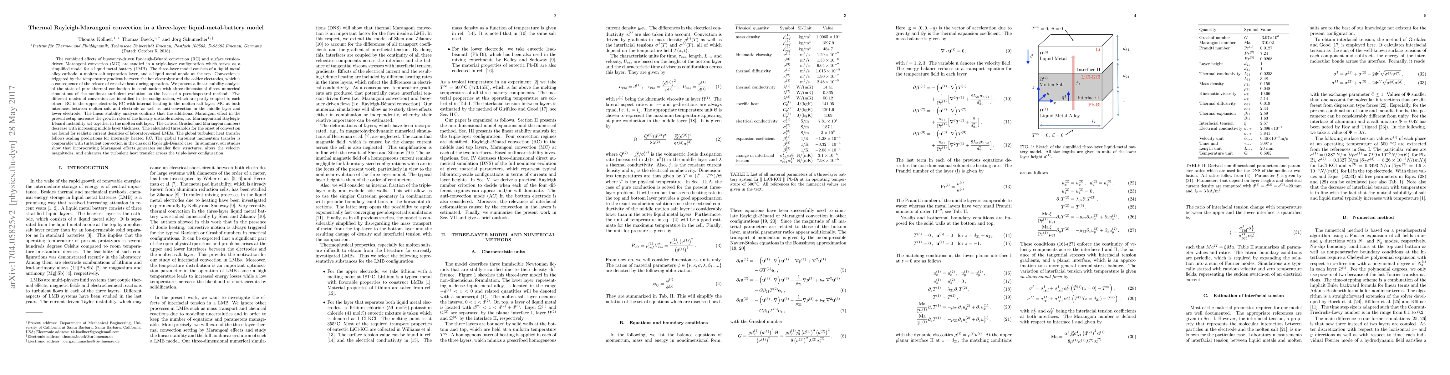 The study employs a linear stability analysis combined with three-dimensional direct numerical simulations (DNS) using a pseudospectral method to investigate the combined effects of buoyancy-driven Rayleigh-Bénard convection (RC) and surface tension-driven Marangoni convection (MC) in a three-layer liquid metal battery (LMB) model.