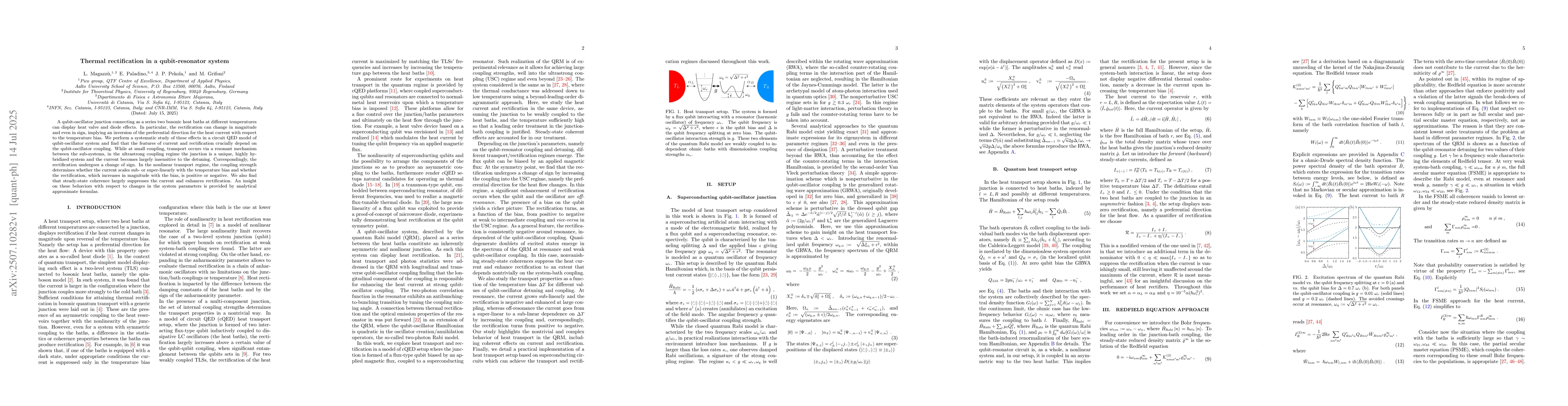 The paper presents a detailed analysis of thermal rectification in a qubit-resonator system, identifying the crucial role of qubit-oscillator coupling in determining current and rectification characteristics.