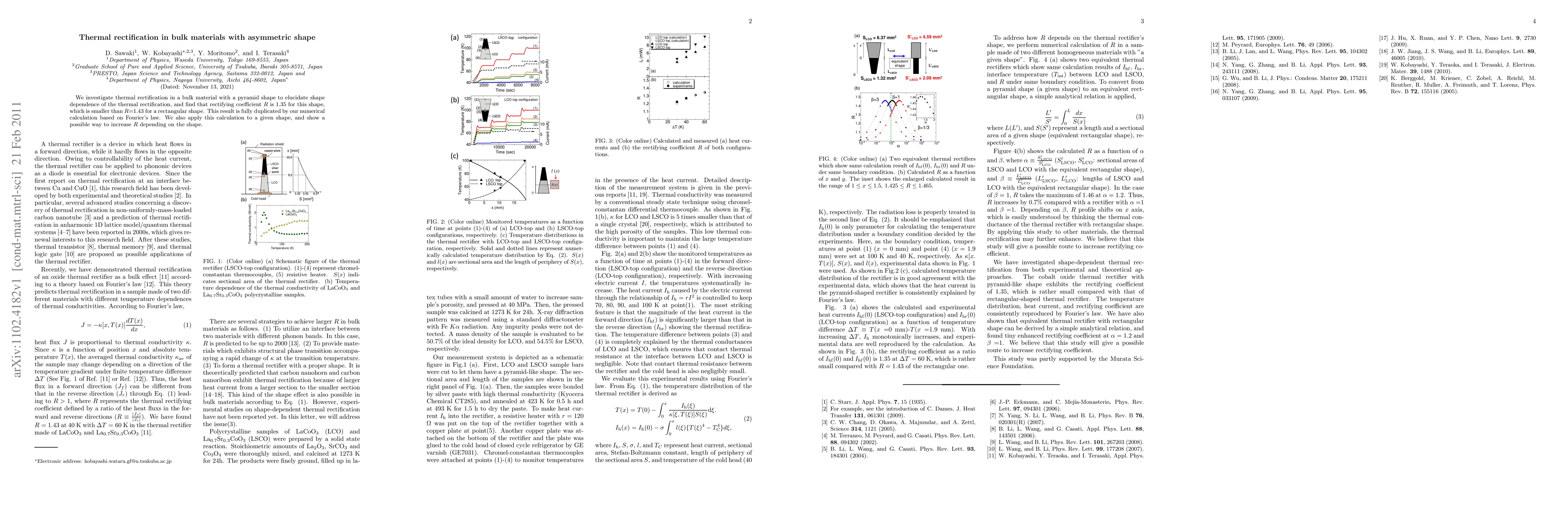 This study investigates thermal rectification in pyramid-shaped bulk materials and finds a rectifying coefficient of 1.35, lower than the 1.43 coefficient for rectangular shapes. Numerical calculations based on Fourier's law confirm these findings and suggest ways to enhance the rectification coefficient by optimizing material shape.