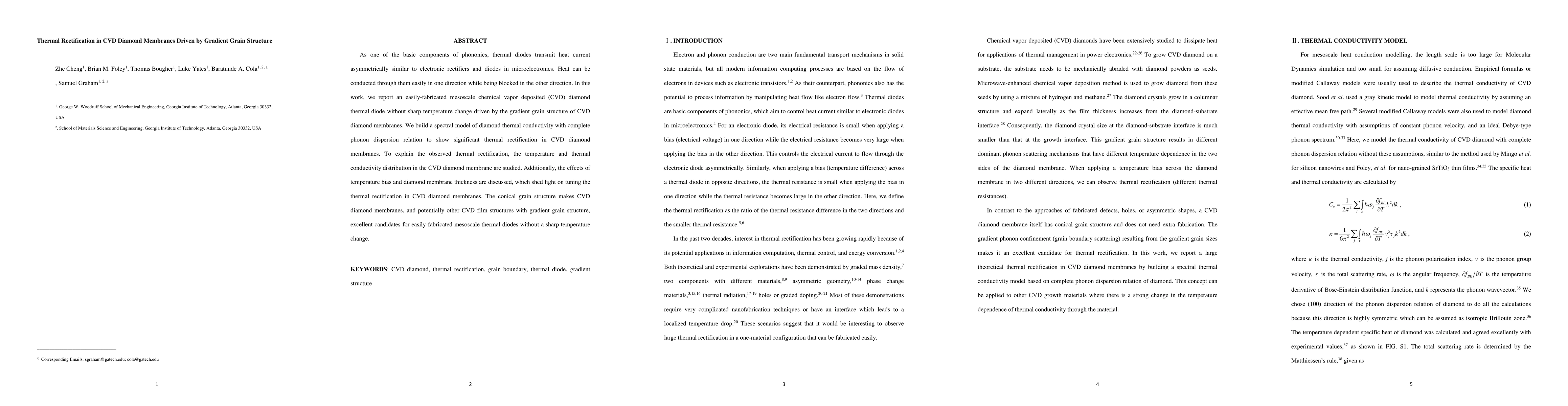 This paper reports on the fabrication of a mesoscale thermal diode using chemical vapor deposited (CVD) diamond membranes driven by a gradient grain structure, demonstrating significant thermal rectification without sharp temperature changes. The study employs a spectral model to explain the thermal conductivity and rectification effects influenced by temperature bias and membrane thickness.