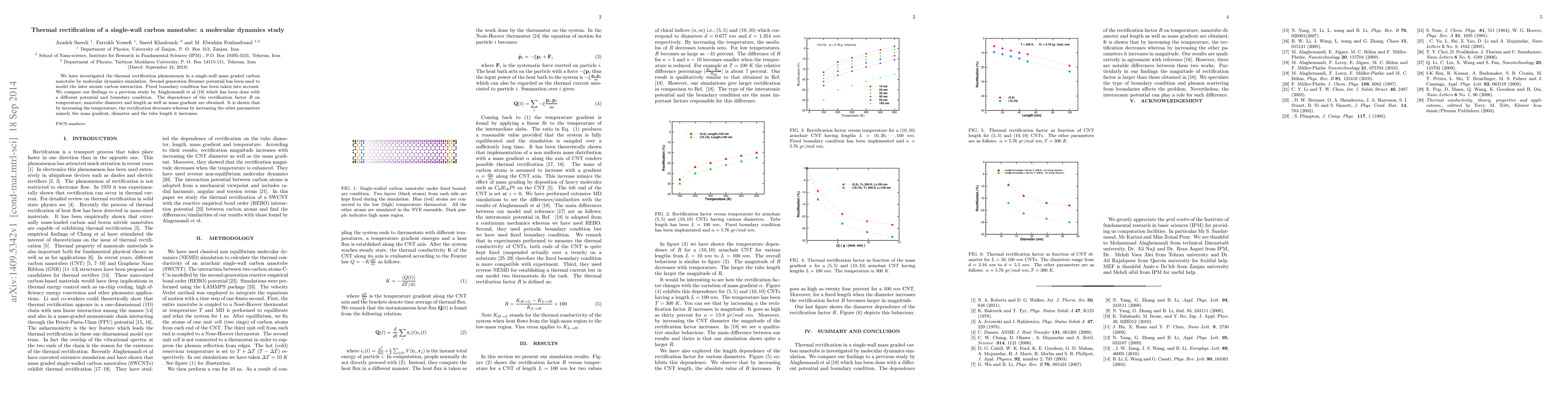 We have investigated the thermal rectification phenomenon in a single-wall mass graded carbon nanotube by molecular dynamics simulation. Second generation Brenner potential has been used to model the inter atomic carbon interaction. Fixed boundary condition has been taken into account. We compare our findings to a previous study by Alaghemandi et al which has been done with a different potential and boundary condition. The dependence of the rectification factor $R$ on temperature, nanotube diameter and length as well as mass gradient are obtained. It is shown that by increasing the temperature, the rectification decreases whereas by increasing the other parameters namely the mass gradient, diameter and the tube length it increases.