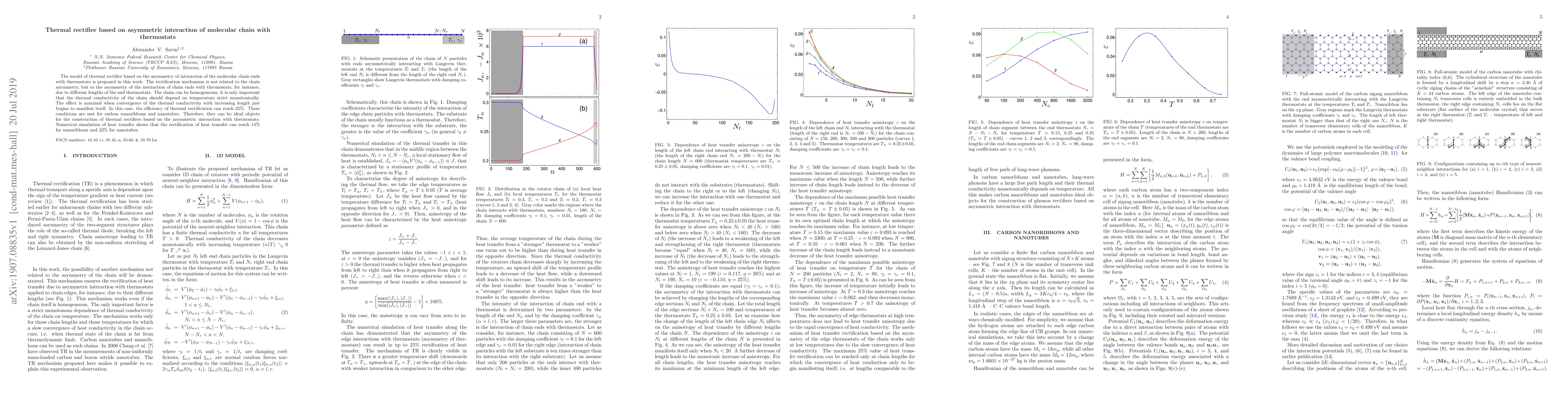 This research proposes a thermal rectifier model based on asymmetric interaction of molecular chain ends with thermostats, not chain asymmetry itself. The efficiency can reach 25%, and conditions are ideal for carbon nanoribbons and nanotubes, showing 14% rectification for nanoribbons and 22% for nanotubes in simulations.