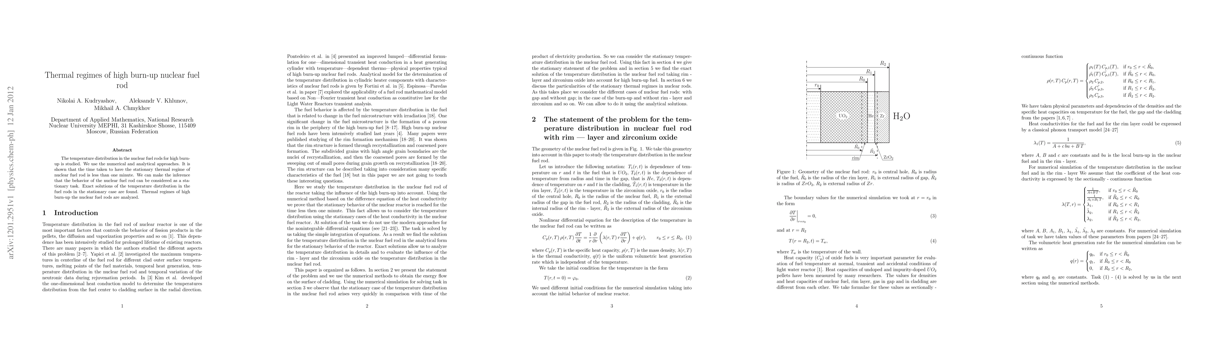 This study investigates the temperature distribution in high burn-up nuclear fuel rods using numerical and analytical methods, revealing that the stationary thermal regime is achieved within one minute, allowing the behavior of the fuel rods to be considered stationary. Exact solutions for the stationary temperature distribution are derived.