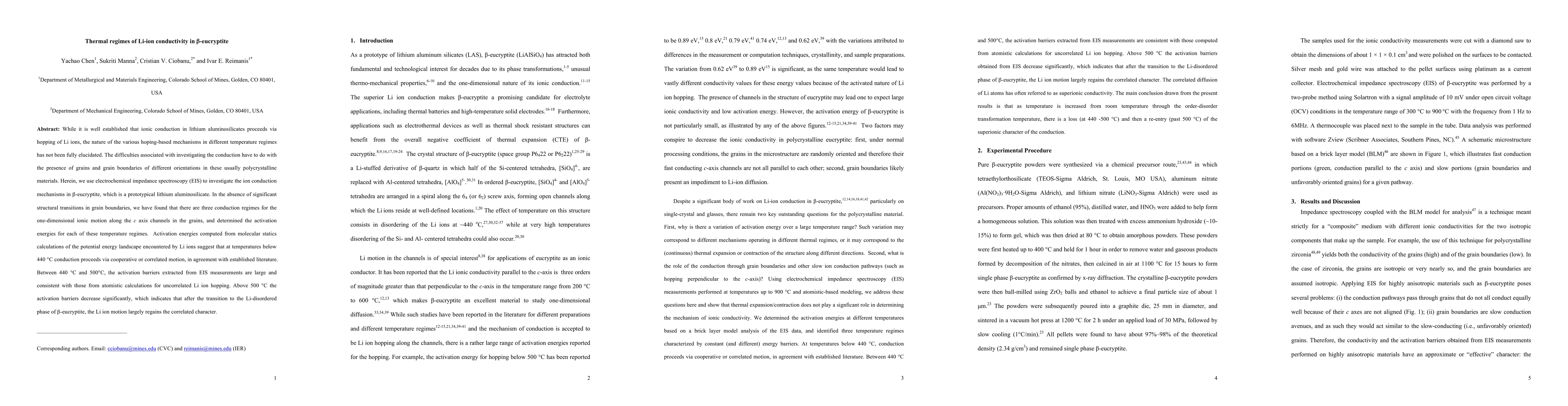While it is well established that ionic conduction in lithium aluminosilicates proceeds via hopping of Li ions, the nature of the various hoping-based mechanisms in different temperature regimes has not been fully elucidated. The difficulties associated with investigating the conduction have to do with the presence of grains and grain boundaries of different orientations in these usually polycrystalline materials. Herein, we use electrochemical impedance spectroscopy (EIS) to investigate the ion conduction mechanisms in -eucryptite, which is a prototypical lithium aluminosilicate. In the absence of significant structural transitions in grain boundaries, we have found that there are three conduction regimes for the one-dimensional ionic motion along the c axis channels in the grains, and determined the activation energies for each of these temperature regimes. Activation energies computed from molecular statics calculations of the potential energy landscape encountered by Li ions suggest that at temperatures below 440 {\deg}C conduction proceeds via cooperative or correlated motion, in agreement with established literature. Between 440 {\deg}C and 500{\deg}C, the activation barriers extracted from EIS measurements are large and consistent with those from atomistic calculations for uncorrelated Li ion hopping. Above 500 {\deg}C the activation barriers decrease significantly, which indicates that after the transition to the Li-disordered phase of -eucryptite, the Li ion motion largely regains the correlated character.