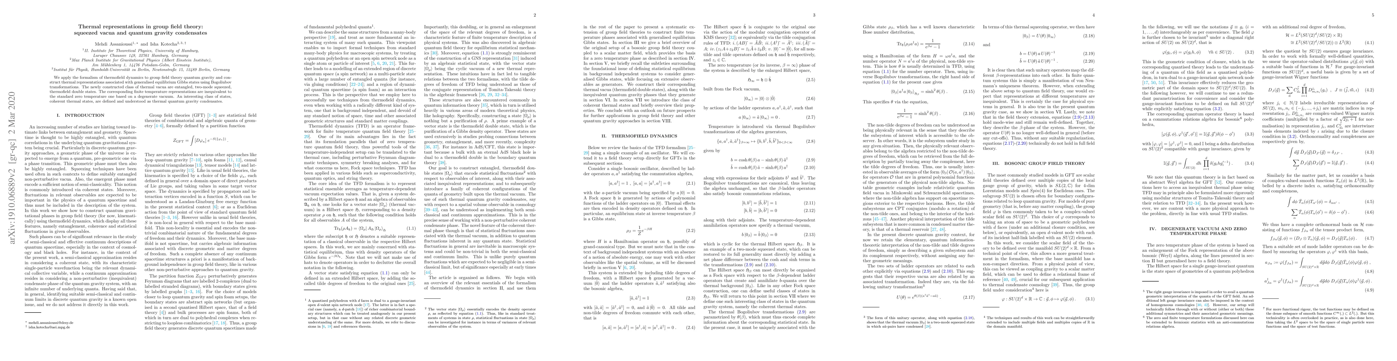 We apply the formalism of thermofield dynamics to group field theory quantum gravity and construct thermal representations associated with generalised equilibrium Gibbs states using Bogoliubov transformations. The newly constructed class of thermal vacua are entangled, two-mode squeezed, thermofield double states. The corresponding finite temperature representations are inequivalent to the standard zero temperature one based on a degenerate vacuum. An interesting class of states, coherent thermal states, are defined and understood as thermal quantum gravity condensates.