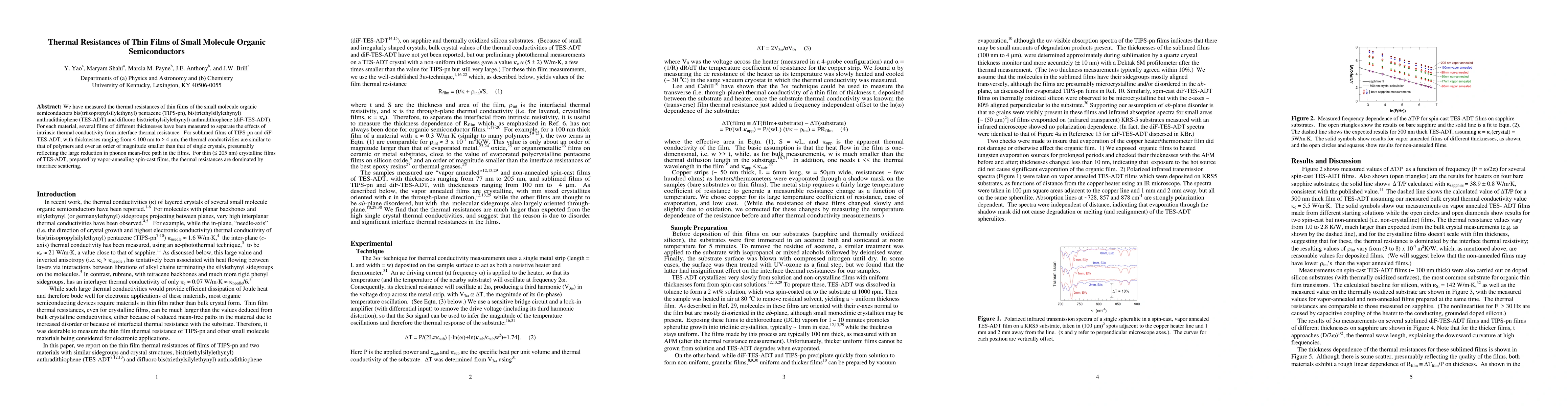 We have measured the thermal resistances of thin films of the small molecule organic semiconductors bis(triisopropylsilylethynyl) pentacene (TIPS-pn), bis(triethylsilylethynyl) anthradithiophene (TES-ADT) and difluoro bis(triethylsilylethynyl) anthradithiophene (diF-TES-ADT). For each material, several films of different thicknesses have been measured to separate the effects of intrinsic thermal conductivity from interface thermal resistance. For non-crystalline films of all three materials, with thicknesses ranging from < 100 nm to > 4 microns, the thermal conductivities are similar to that of polymers and over an order of magnitude smaller than that of the crystals, reflecting the large reduction in phonon mean-free path in the films. Thin (< 205 nm) crystalline films of TES-ADT, prepared by vapor-annealing spin-cast films, have also been measured, but for these the thermal resistances are dominated by interface scattering.