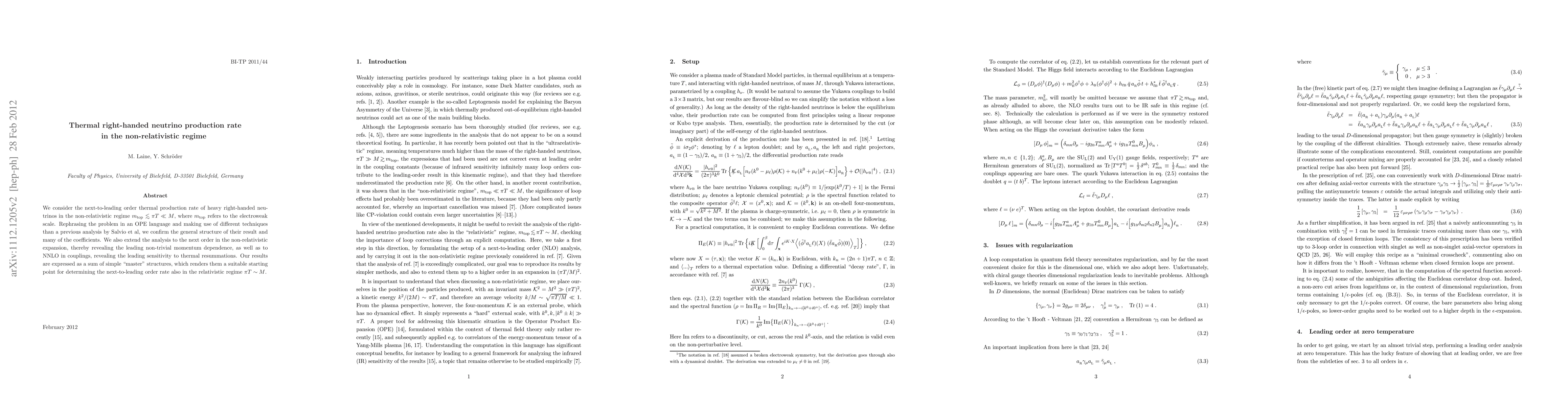 This paper investigates the next-to-leading order thermal production rate of heavy right-handed neutrinos in the non-relativistic regime, confirming previous results and extending the analysis to reveal leading non-trivial momentum dependence and thermal resummation sensitivities. The findings are presented in a simplified "master" structure for future applications.
