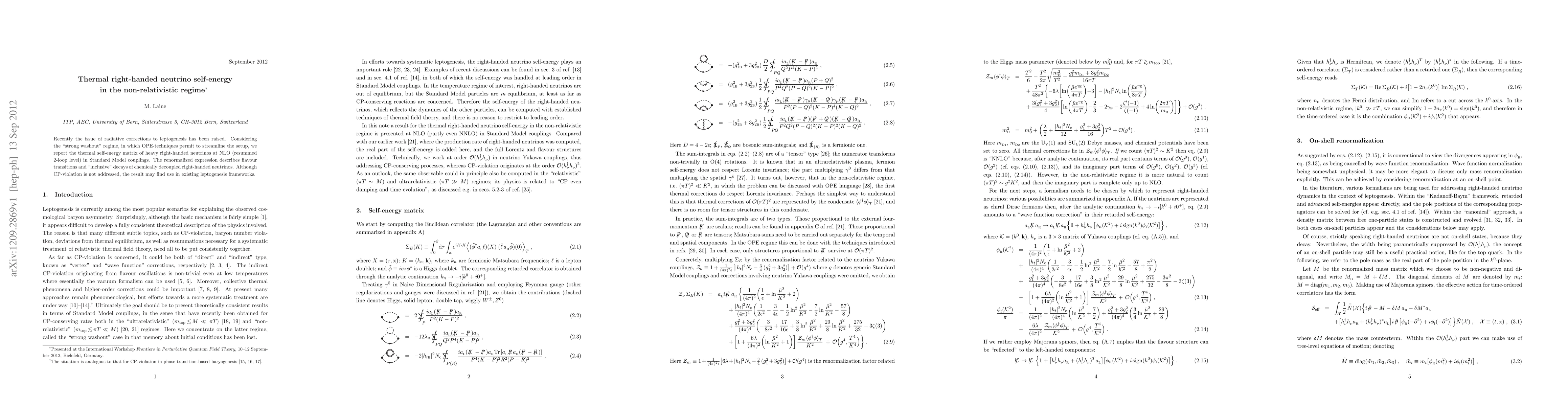 Recently the issue of radiative corrections to leptogenesis has been raised. Considering the "strong washout" regime, in which OPE-techniques permit to streamline the setup, we report the thermal self-energy matrix of heavy right-handed neutrinos at NLO (resummed 2-loop level) in Standard Model couplings. The renormalized expression describes flavour transitions and "inclusive" decays of chemically decoupled right-handed neutrinos. Although CP-violation is not addressed, the result may find use in existing leptogenesis frameworks.