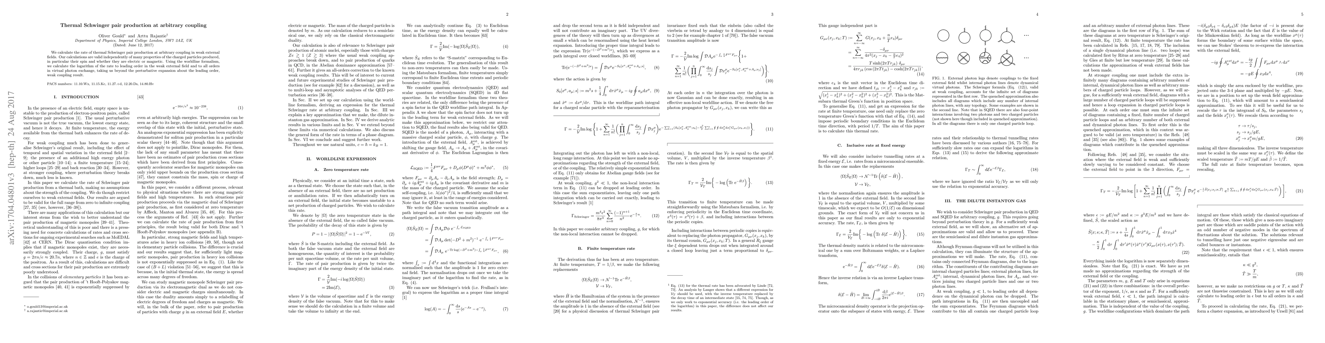 We calculate the rate of thermal Schwinger pair production at arbitrary coupling in weak external fields. Our calculations are valid independently of many properties of the charged particles produced, in particular their spin and whether they are electric or magnetic. Using the worldline formalism, we calculate the logarithm of the rate to leading order in the weak external field and to all orders in virtual photon exchange, taking us beyond the perturbative expansion about the leading order, weak coupling result.