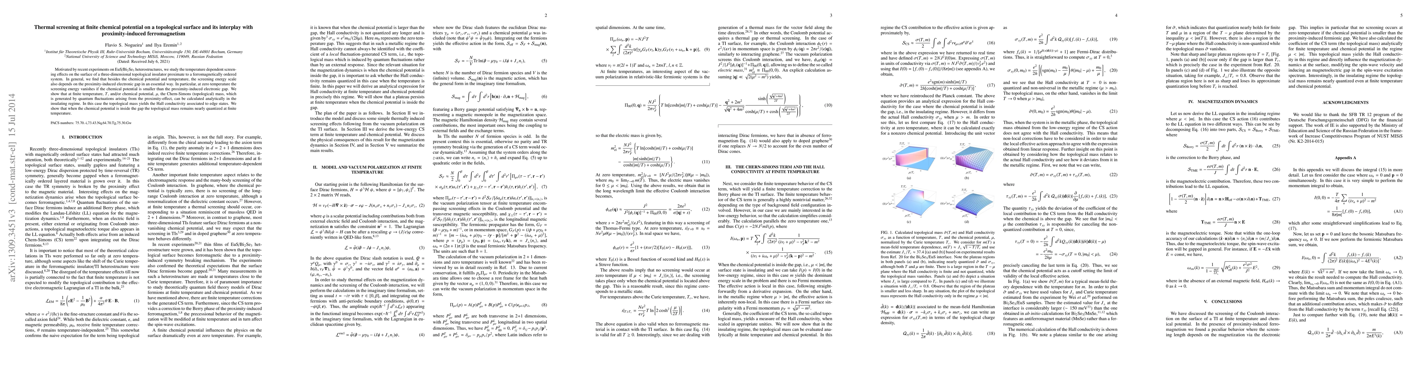 Motivated by recent experiments on EuS/Bi$_2$Se$_3$ heterostructures, we study the temperature dependent screening effects on the surface of a three-dimensional topological insulator proximate to a ferromagnetically ordered system. In general, we find that besides the chemical potential and temperature, the screening energy scale also depends on the proximity-induced electronic gap in an essential way. In particular, at zero temperature the screening energy vanishes if the chemical potential is smaller than the proximity-induced electronic gap. We show that at finite temperature, $T$, and/or chemical potential, $\mu$, the Chern-Simons (topological) mass, which is generated by quantum fluctuations arising from the proximity-effect, can be calculated analytically in the insulating regime. In this case the topological mass yields the Hall conductivity associated to edge states. We show that when the chemical potential is inside the gap the topological mass remains nearly quantized at finite temperature.